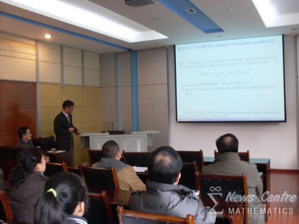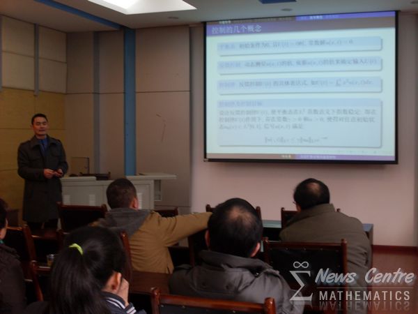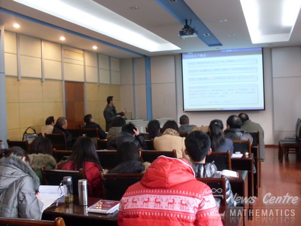 报告会开始后首先由吴强教授为大家讲解整超限直径与代数整数,吴教授通过放映PPT课件介绍了【0,1】区间上的整超限直径,给出了次数为d的整系数多项式H的最大值的最小值的一个较好的上界B,还给出了它在解决最优化问题方面的应用。经过短暂的休息之后由谢成康教授讲解反应扩散过程中的温度边界控制。它在实现温度稳定的温度控制,尤其是需要特定温度的化学反应和生物发酵工程方面有着广泛的应用。