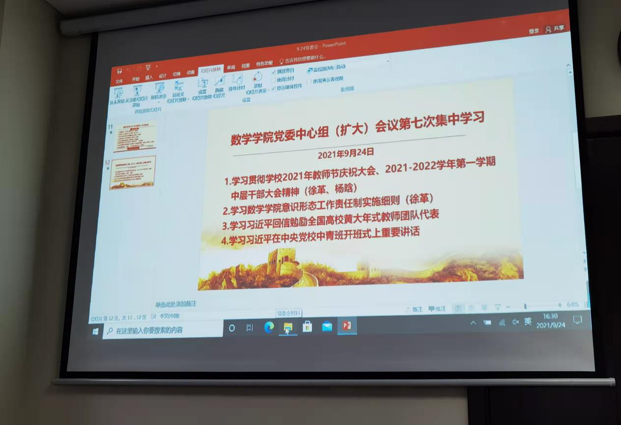接下来,徐革书记和杨晗常务副院长分别传达了学校2021年教师节庆祝大会暨2021-2022学年第一学期中层干部大会精神:王顺洪书记在学校庆祝第37个教师节大会上的重要讲话强调了高等教育对于党和国家事业发展的重要作用,强调了优秀教师队伍对于复兴交大的重要作用,同时对全体教师尤其是新入职教师提出了殷切希望;杨丹校长的工作报告全面总结了学校2021年上半年各项工作进展和取得的成绩,科学分析了学校发展面临的新形势、新要求、新场景,针对性地指出了学校发展中存在的问题和矛盾,并部署了2021年下半年学校各项重点工作。会上,结合数学学科在学校的发展定位,就学院本学期重点工作的推进进行了讨论。