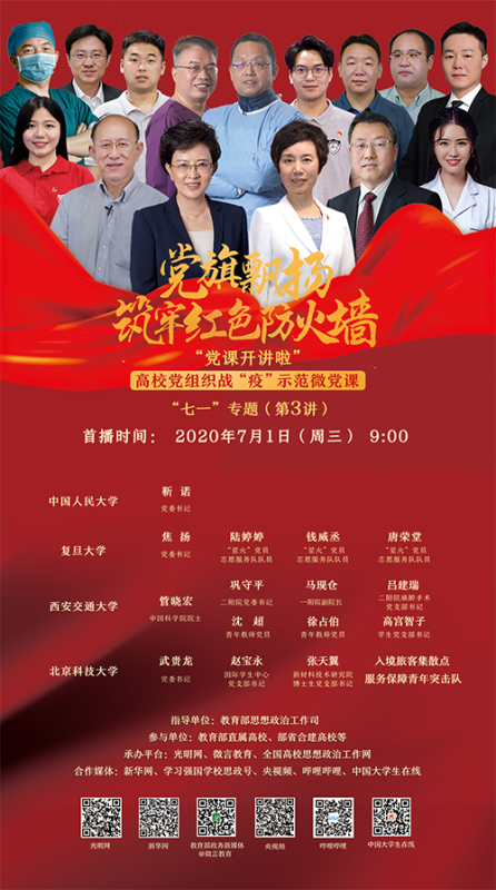 为充分发挥基层党组织战斗堡垒作用和师生党员先锋模范作用,让党旗始终高高飘扬在疫情防控、返校复学、事业发展全过程全方位,根据教育部思想政治工作司工作部署,“党旗飘扬、筑牢红色防火墙”之高校党组织战“疫”示范微党课“七一”专题(第3讲)将于近期播出,首播时间和观看平台如下。