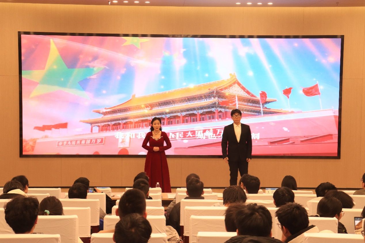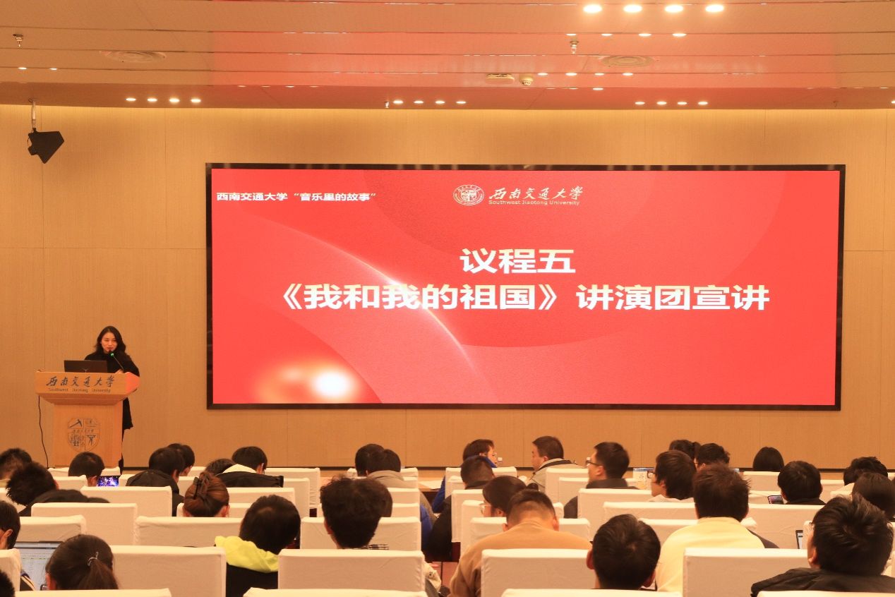 党委学生工作部“音乐里的故事”讲演团代表李庶祎为同学们宣讲《我和我的祖国》。艺术团成员向小丫、张家骏带来歌曲《我和我的祖国》,随后李庶祎讲述了中国科学院学部原委员郭永怀以身许国的故事,并指出了交大人与祖国的联系,最后全体同学合唱《我和我的祖国》。
