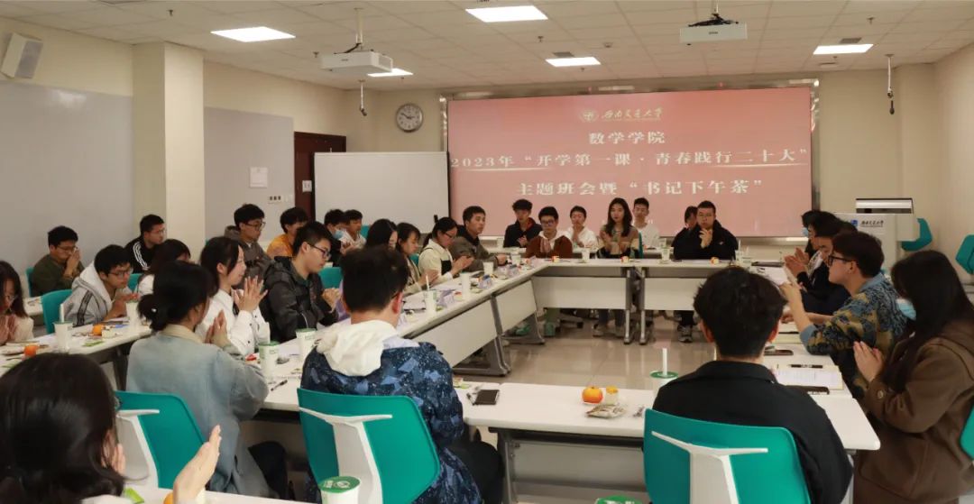 习近平总书记在党的二十大报告中寄语青年“广大青年要坚定不移听党话、跟党走,怀抱梦想又脚踏实地,敢想敢为又善作善成,立志做有理想、敢担当、能吃苦、肯奋斗的新时代好青年,让青春在全面建设社会主义现代化国家的火热实践中绽放绚丽之花。”本次“青春践行党的二十大”主题班会暨“书记下午茶”活动通过优秀学生代表的经验分享,鼓励全体同学积极向上,敢于拼搏,为实现第二个百年奋斗目标作出新的更大贡献。