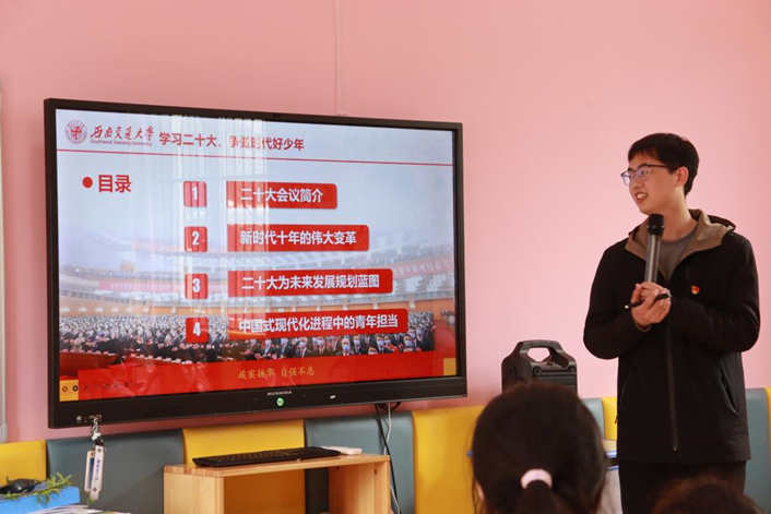 下午1时,成员们分为两组进行活动。一组前往党群服务中心协助当地志愿者进行设施修缮工作,一组在儿童之家为小朋友进行授课。下午的授课环节首先由研究生党员代表魏波同学为小朋友们讲解党的二十大精神核心要义。随后,天文社代表刘佳美、王梓涵、龚垚同学为小朋友们讲述天文知识,通过播放视频、做游戏等方式调动小朋友们的积极性,在轻松愉悦的氛围中传播科技知识,以寓教于乐的方式培养了小朋友们的理科思维。