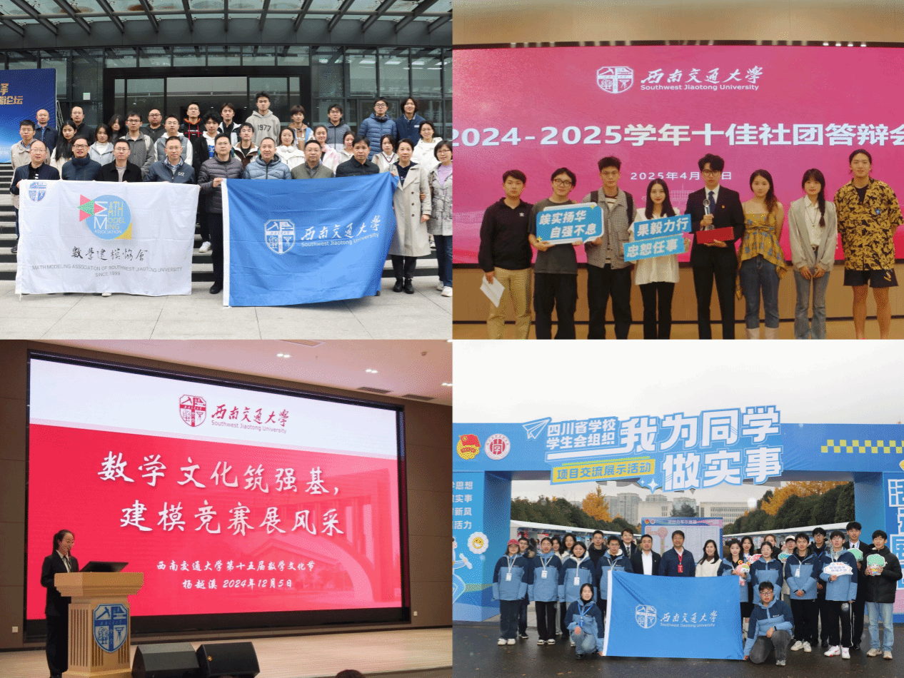 以五育并举为主线,以“思政+”、“学科+”、“交通+”为牵引,以校园文化活动为载体,在服务中长才干。数学建模协会蝉联“十佳学生社团”荣誉称号,“数学+”学科赋能本科生综合素养提升项目入选四川省“我为同学做实事”百佳项目、最受同学欢迎项目。