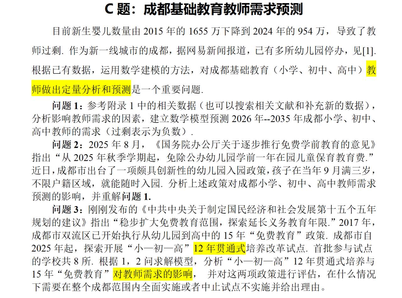 “生育支持与四川人口增长预测” 聚焦宏观社会人口议题,要求参赛者基于四川省人口数据与最新生育支持政策构建数学模型,精准预测未来人口变化趋势与基础教育教师需求,并定量评估不同政策方案的潜在影响。此题的成功解答,既依赖于对人口学模型的深刻理解与灵活应用,也强调了数据搜集与处理的能力,凸显数据驱动下的预测分析与政策仿真核心素养。