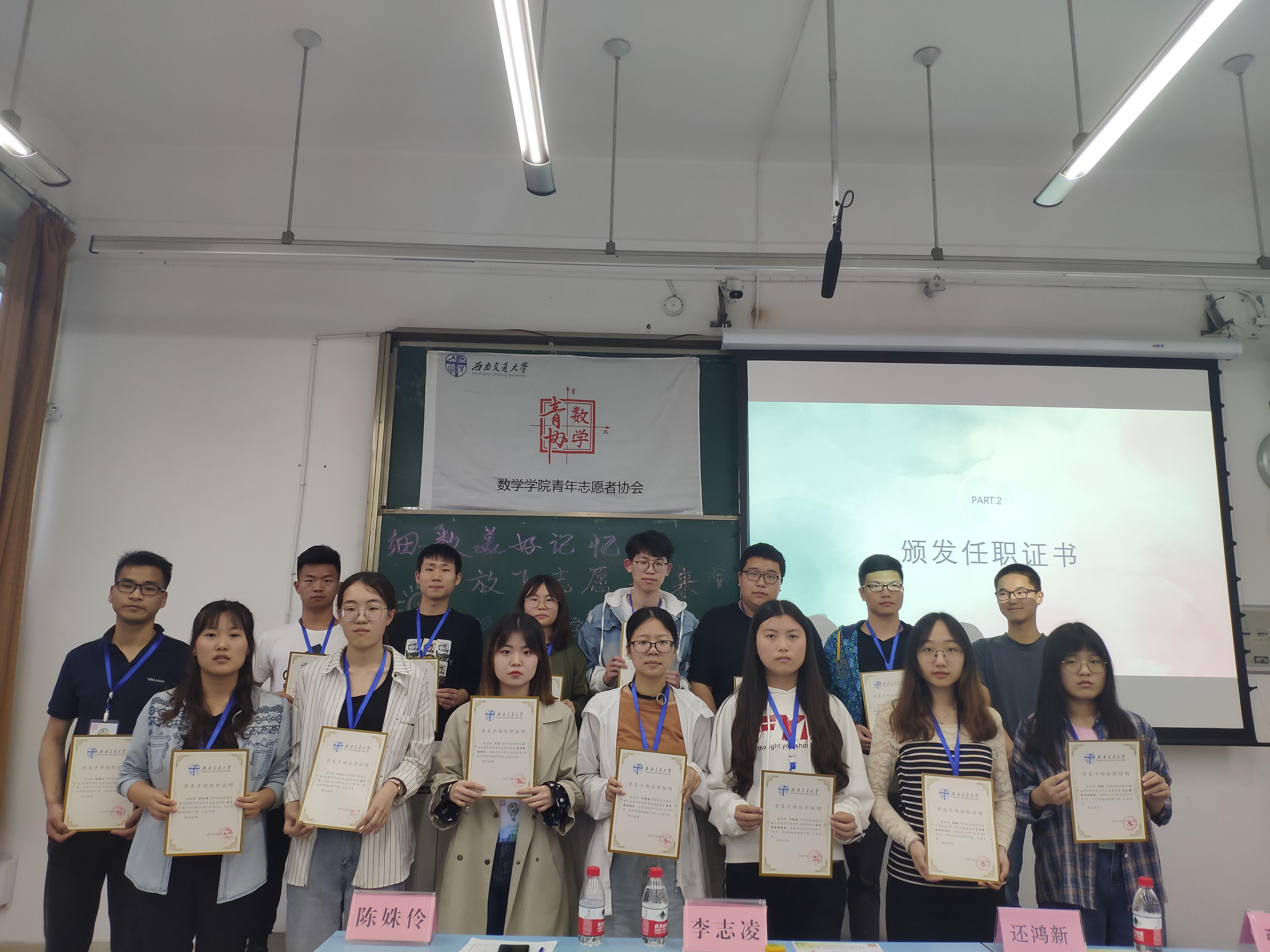 团委副书记还鸿新为努力工作的会长、部长颁发任职聘书,并鼓励他们在接下来的工作中再接再厉,带领数学青协获得十佳青协的荣誉!
