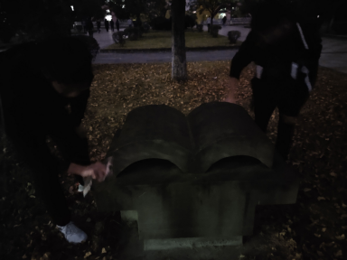 在26日下午5时,寒风瑟瑟,但部门同学们依旧精神抖擞地在虹桥西侧的“书”石碑和“启示”石碑前集合,女生拿着抹布,男生则带来了扫帚和簸箕。首先,综合事务部部长对部员进行分工,由于先前开展过一次雕塑清理活动,同学们对于工作流程和细节等十分了解,很快就投入到清理活动中去了。
