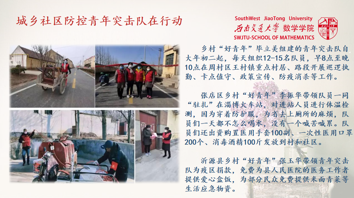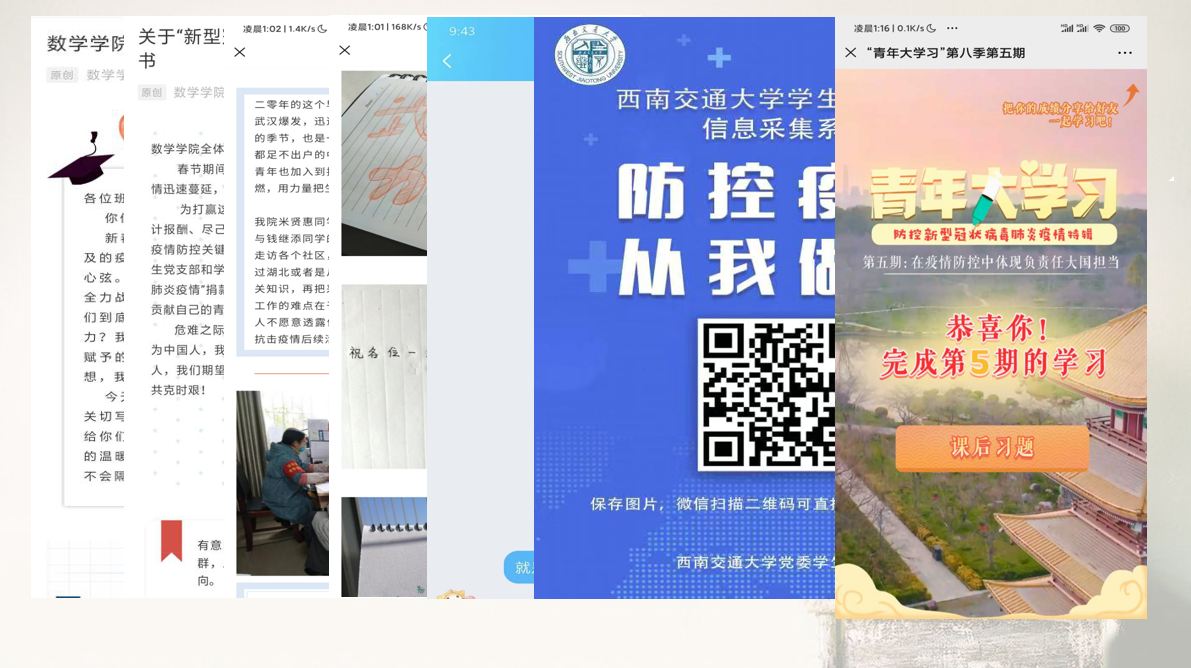 学生健康状况信息采集系统的填报以外,学院发起了针对“新型冠状病毒疫情”的捐款,号召我们献出爱心。数院团员同样积极参与抗疫志愿者活动,米贤惠就是其中一员。他们与社区工作人员一起走访各个社区,进行登记人员信息等工作,为打赢疫情阻击战贡献自己的青春力量。