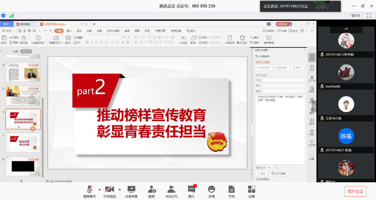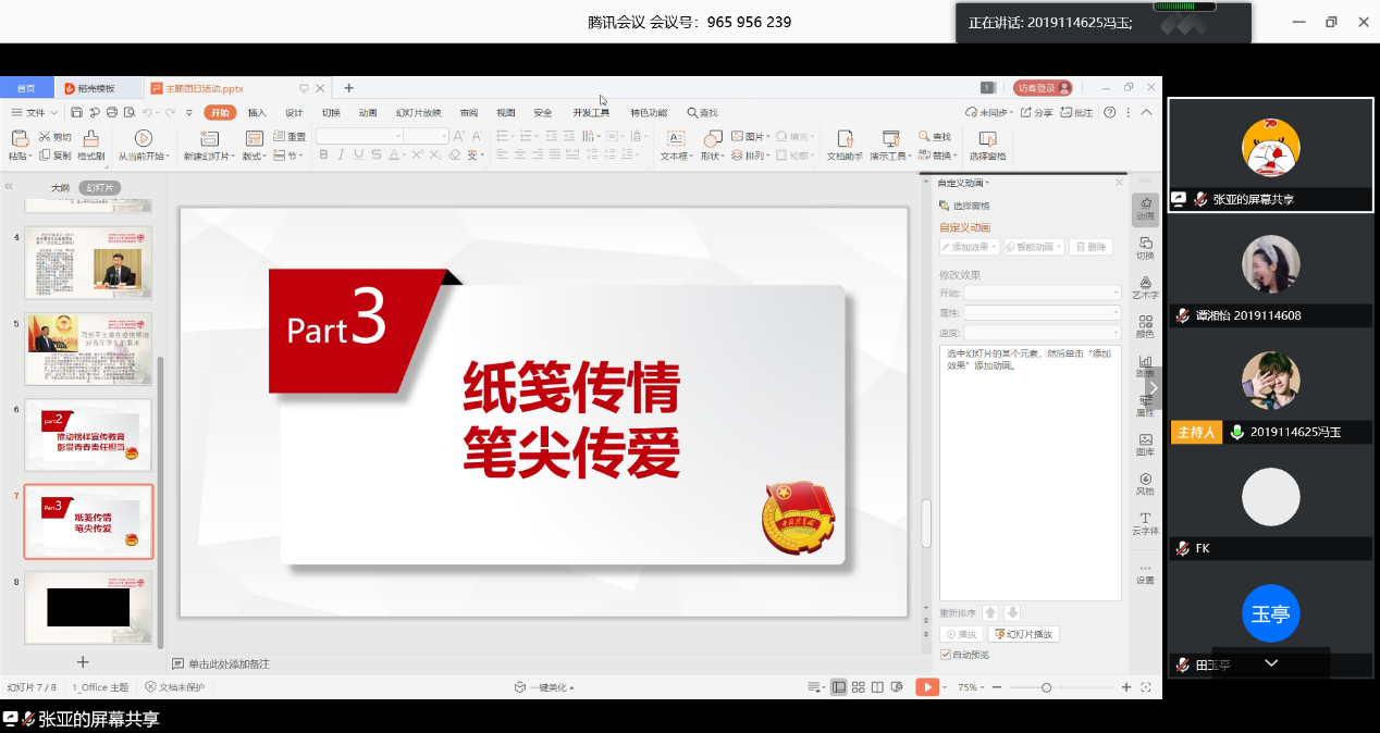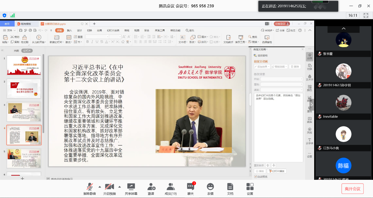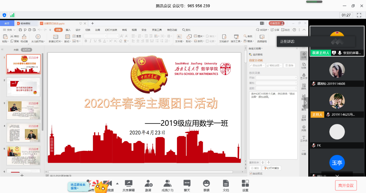 应用数学2019级1班团支部于4月23日下午两点通过腾讯会议成功开展了以“共抗疫情·爱国力行”为主题的线上团日活动,旨在落实防疫举措、强化思想引领、加强主题教育。本次线上团日活动由团支书冯玉主讲,支部全体团员青年积极参加,团委干部懂欢宁、何未到会参加。