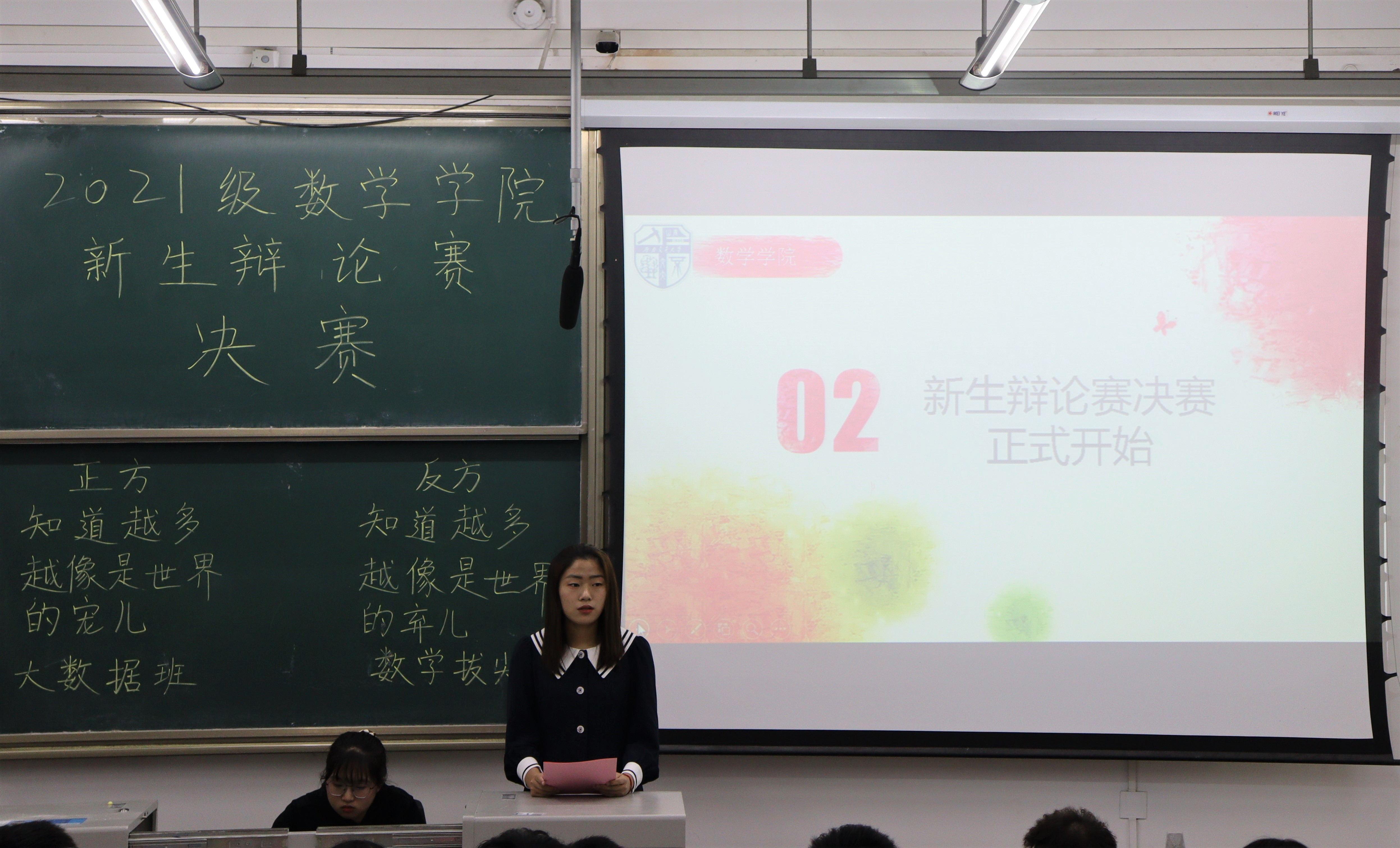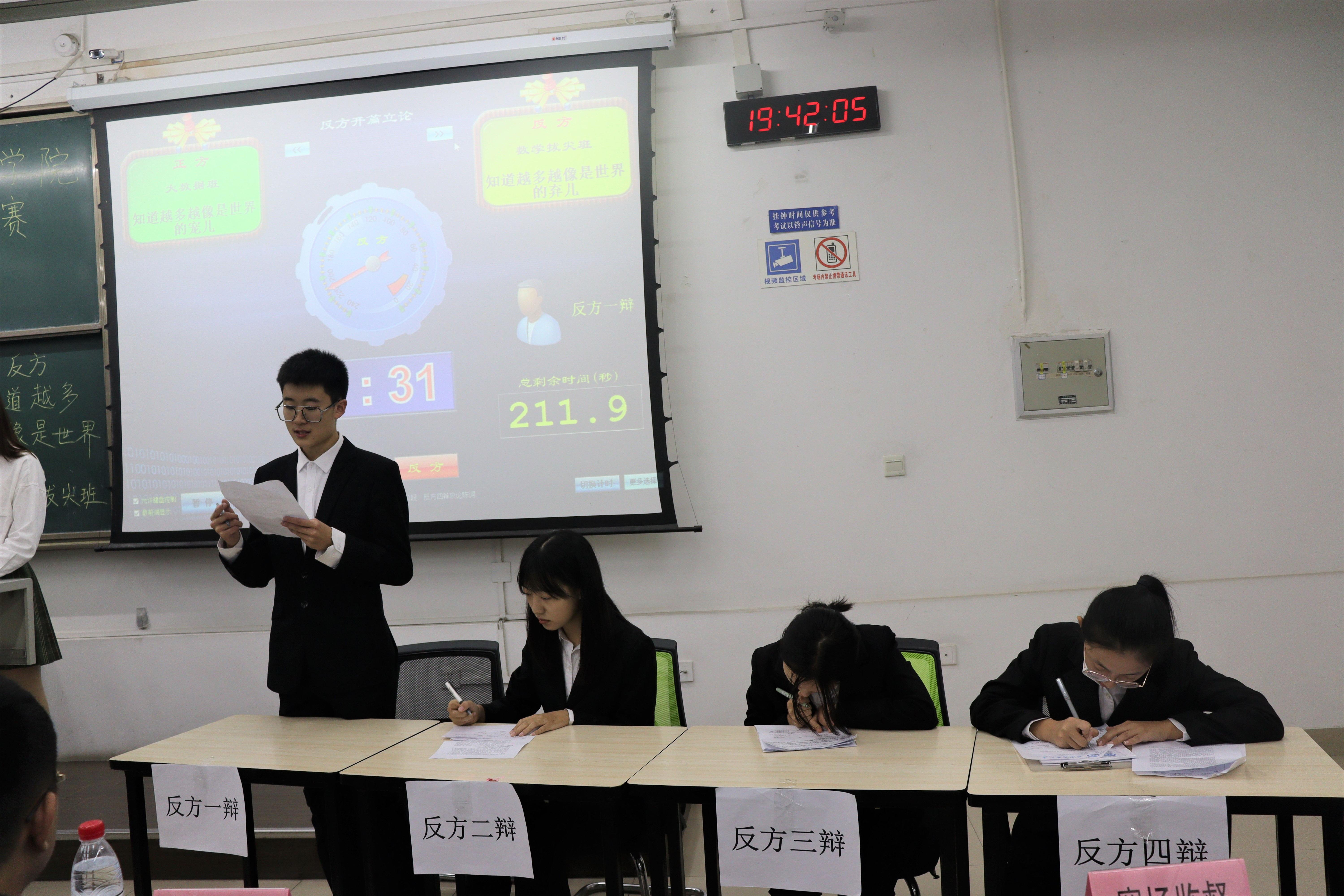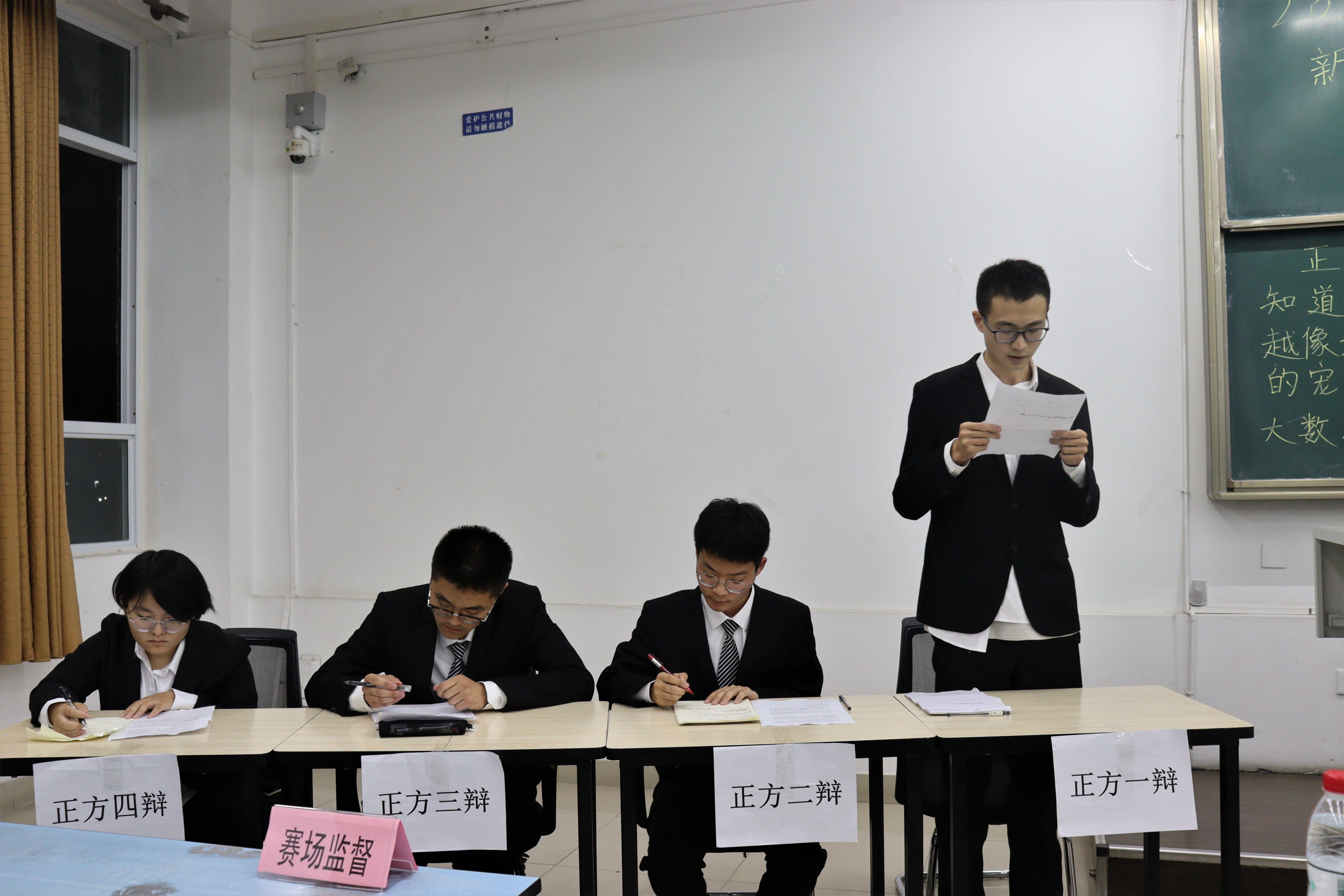 此次比赛的辩题为“知道越多越像是世界的宠儿/弃儿”。正方为大数据一班代表队的王泰桦、岳思毅、张哲、甄佳宇,反方为数学基地班代表队的马万里、张琮琪、朱纯雨、杨婧悦。