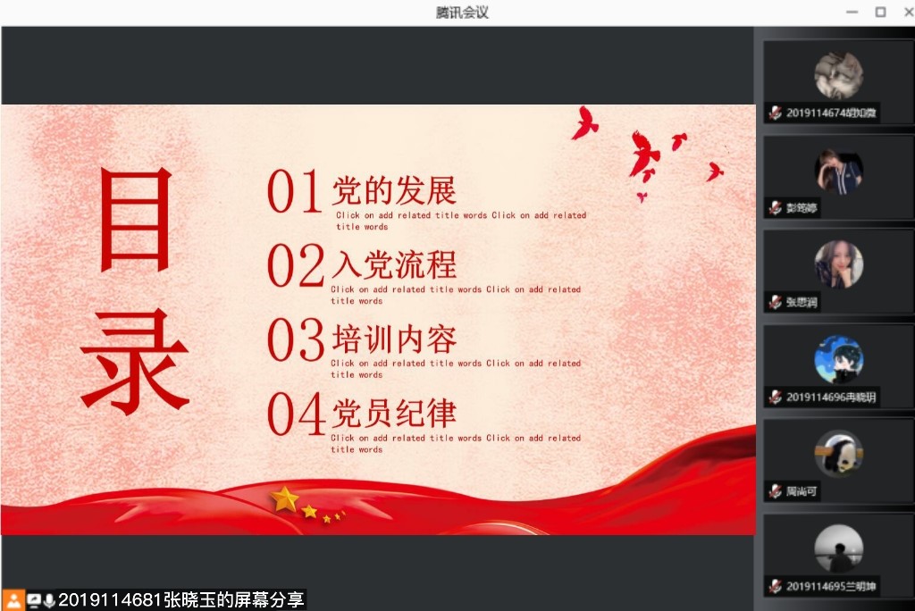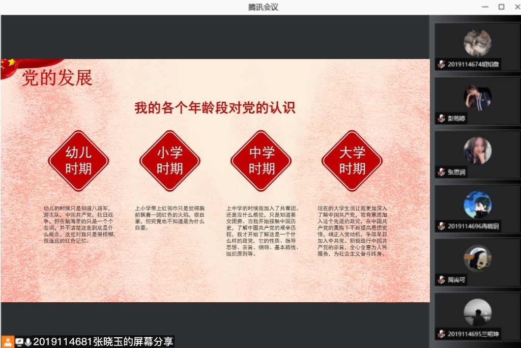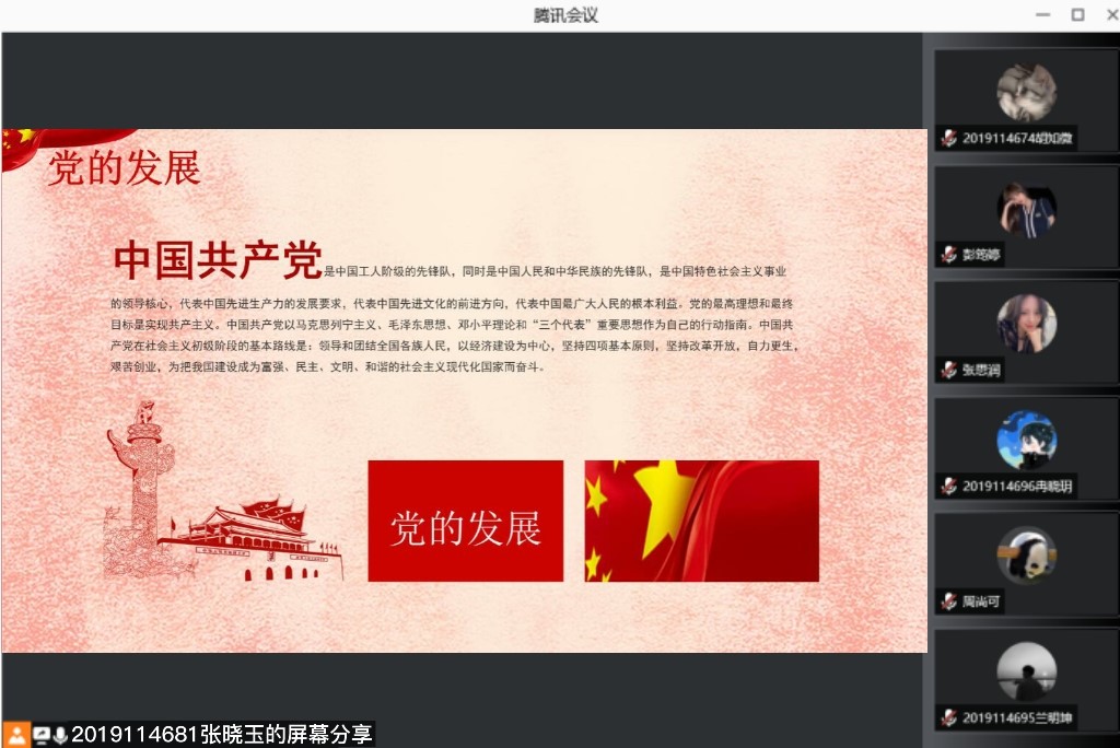 党建中心活动部部长张晓玉于2021年11月25日晚召开了“不忘初心跟党走”入党宣讲会。本次大会由团支书葛田田同学主持,2019级统计1班全体同学参会。