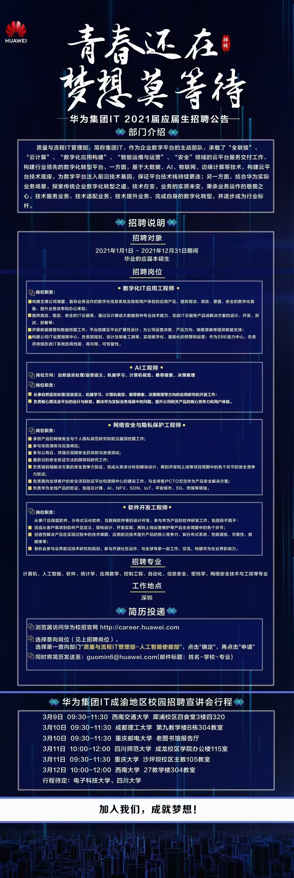 华为集团IT应届毕业生91暗网 专场招聘会,时间:2021年3月9日晚上7:00,地点:四食堂三楼317会议室