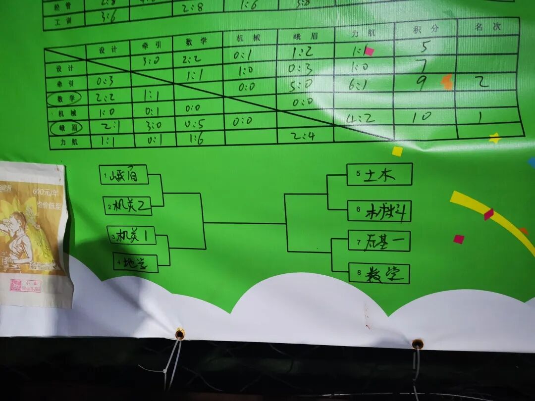 代表队先是以2比2的比分与种子队设计学院握手言和,而后在与实力强大的机械学院代表队的交锋中力保球门不失,0比0互交白卷。随后以6比1的比分力挫力航学院代表队,更是以5比0绝对优势击败小组第一峨眉代表队,最后与颇具实力的牵引动力代表队以1比1的比分结束小组赛的征程。最终在小组赛阶段5轮积9分昂首出线,创造院史!