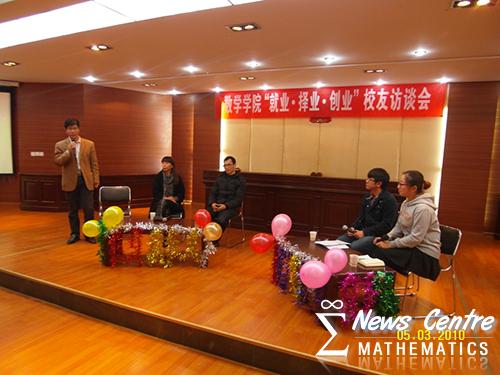 党委书记兼院长陈尚云老师代表学院师生为三位学长、学姐送上了纪念品并讲话。他提到,困惑于广大数学学子的问题——“学习数学能干什么?”在今天的访谈会上三位嘉宾为大家做了精彩的解答,在同学们的学习、生活的过程中要多体会“有用之用”和“无用之用”。最后他引用陈木法院士的话“学习数学的人幸福感最强”送给在座的数学学子。
