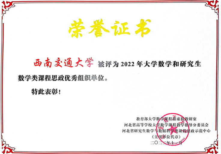 为深入贯彻全国教育大会、全国高校思想政治工作会议精神,推进大学数学课程群虚拟教研室数学类课程思政建设,2022年10月,教育部大学数学课程群虚拟教研室联合河北省高等学校大学数学课程教学指导分委员会和河北省研究生数学与数据科学类课程思政示范中心联合开展了大学数学和研究生数学类课程思政评选活动,西南交大荣获优秀组织奖。