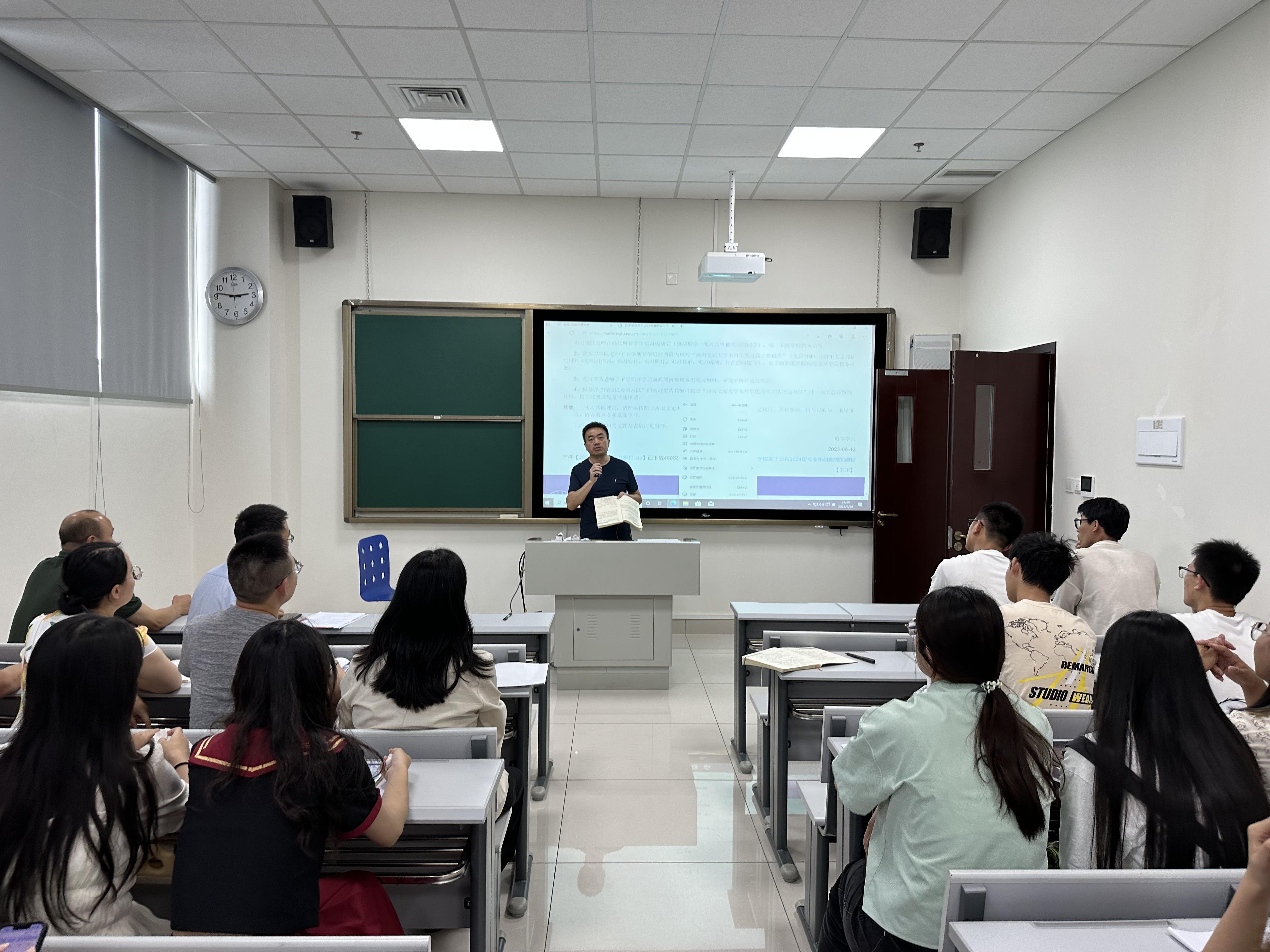 6月28日下午,学院召开了暑期实习动员会,数学与应用数学、统计学以及数据科学与大数据技术专业参加暑期实习的全体本科生和带队老师参加了会议。会上,潘小东副院长就实习方案进行了讲解,介绍了实习总体安排、集中实习的相关规定、实习工作纪律及考核要求、实习成绩管理规定等。黄祥副书记就暑期实习注意事项进行讲解,提出思想上高度重视、安全纪律上高度重视、行为规范上高度重视,希望同学们以积极的心态、高度的安全意识、饱满的热情投入到实习中。实验中心主任潘志刚老师就实习相关准备工作进行了讲解,学院成立了暑期实习带队工作组,每天有带队老师、辅导员和院领导在现场开展工作,保障暑期实习安全、有序开展,进一步提高暑期实习工作质量。