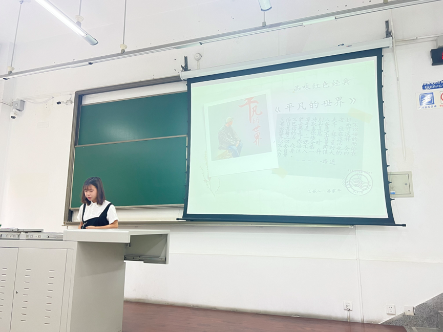 第二组分享的读本是《平凡的世界》。他们谈到,人在社会的大背景下虽然是微不足道的,但是在社会中却缺一不可,就像是人不能缺少那种中流砥柱的精神一样。我们每个人的生活都是一个世界,即使最平凡的人也要为自己生活的那个世界而奋斗。