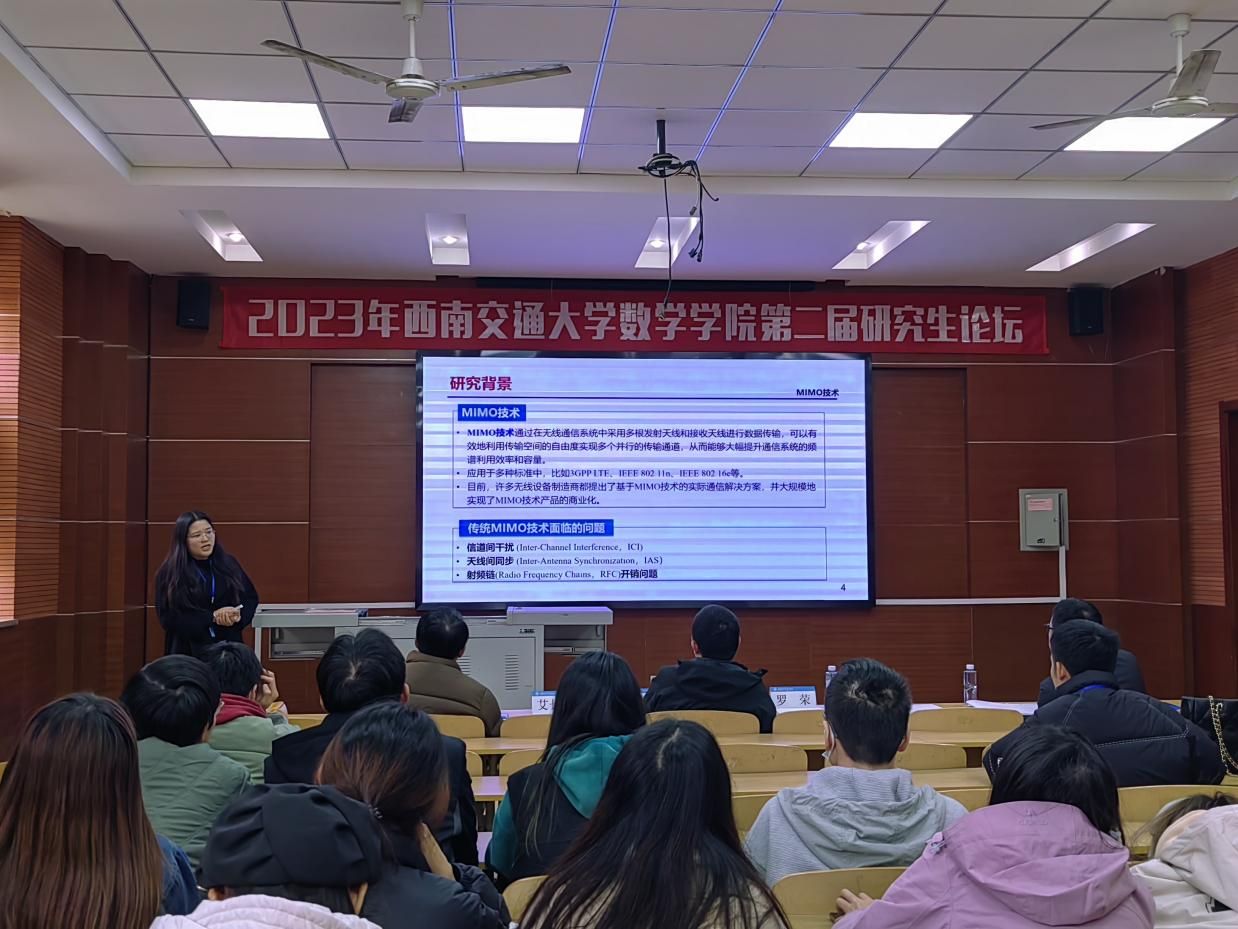 随后,21级博士研究生徐丽、蒲哲分别开展了题为“循环码的微分码及其微分译码算法”、“随机p-Laplacian抛物方程的动力学行为及其数值逼近”的专题报告。徐丽主要介绍一种基于循环码的代数表示而构建的,适于概率信息传递的分解-重构结构,并给出相应的循环码概率译码机制。蒲哲主要介绍了无界薄域上的随机 p-Laplacian方程的动力学行为,严格证明了随机吸引子的存在性,并且得到了吸引子的上半连续性。这两位优秀博士研究生的报告不仅展示了他们在各自领域中的深入研究,也为与会者呈现了数学研究的魅力和潜力。
