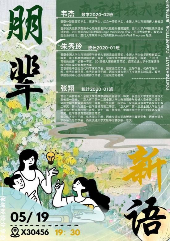 于5月19日和5月24日开展了两期“朋辈新语”经验交流活动。活动邀请了韦杰、朱秀玲、张翔、贾浩、胡洋五位同学,向立志保研、考研的同学分享了自身经验,并解答了相关疑问。
