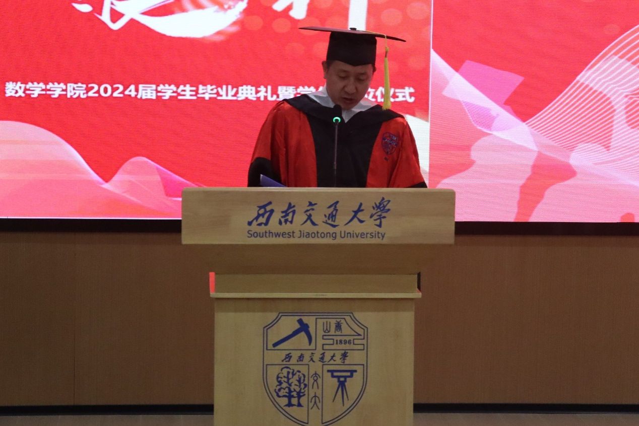 典礼第一项,院长杨晗教授致辞。杨晗院先向2024届全体毕业生致以热烈的祝贺,对教职工、家长亲友的辛勤付出表示诚挚的感谢。离别之际,杨晗院长对毕业生寄予四点厚望,一为:做一个对得起国家、社会和自己的人。要志存高远、勤奋笃行、不断进取、追求卓越,成为“为学、为事、为人”的典范。二为:做一个热爱学习、保持奔跑的人。信息时代是数学人大有作为的时代,要始终保持一种学习的状态,锻炼改造自我、改造社会的能力,自信从容地面对未来的挑战。三为:做一个独立思考、温暖纯良的人。保持独立思考的能力,经历人生的磨砺后依旧怀抱善良和热爱,与世界共同成长。四为:做一个赶路并欣赏风景的人。尽管未来充满未知与挑战,也要保持平常心,享受旅途的每一个瞬间。最后,杨晗院长再次祝愿2024届毕业生们“所见皆美好,所行皆坦途,所爱皆可得,所想皆如愿”。
