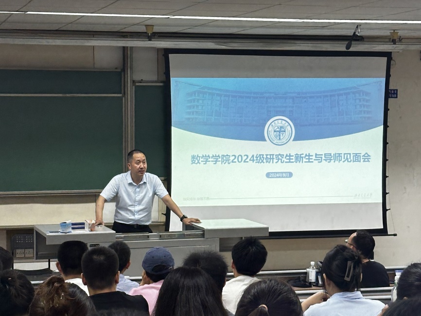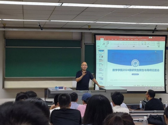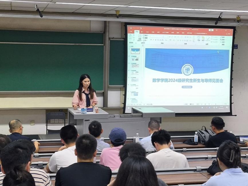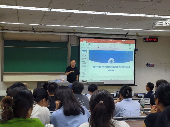 院长杨晗、院长助理杨洋、数学系主任刘品、信息与计算科学系主任孟华、统计学系主任唐家银及研究生辅导员盖少通,与2024级全体硕士研究生和博士研究生共同参与,会议由辅导员盖少通主持。