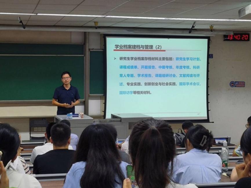 接着,院长助理杨洋教授围绕“为什么读研?读研过程中需要做什么?怎样成为一名合格的研究生?”这三个核心问题,详细介绍了硕士研究生和博士生研究生的培养方案,使同学们有了更为清晰的学习目标和更为明确的学习规划。杨洋教授强调,研究生应学会根据不同阶段的主要任务进行自主学习,积极参与科研项目和学术交流,主动培养自己提出问题、思考问题和解决问题的能力,提升自己的综合素质。