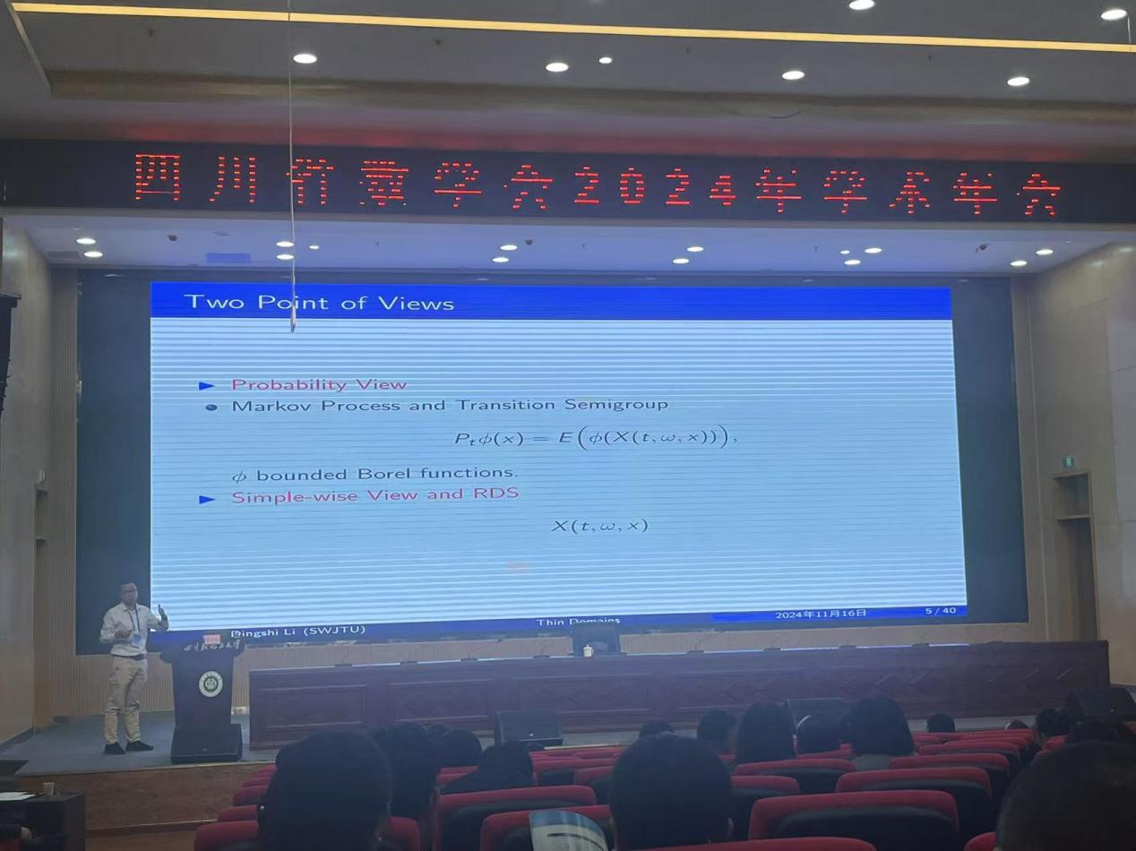 黎定仕教授在年会主会场宣讲了报告“Pullback measure attractors for non-autonomous stochastic reaction-diffusion equations on thin domains”。该报告主要介绍了薄域上非自治随机反应扩散方程的拉回测度吸引子的极限行为。首先给出了拉回测度吸引子的定义,接着证明了与随机方程相关的非齐次马尔可夫过程的拉回测度吸引子的存在性和唯一性,然后建立了当区域坍缩为低维域时,这些吸引子的上半连续性。
