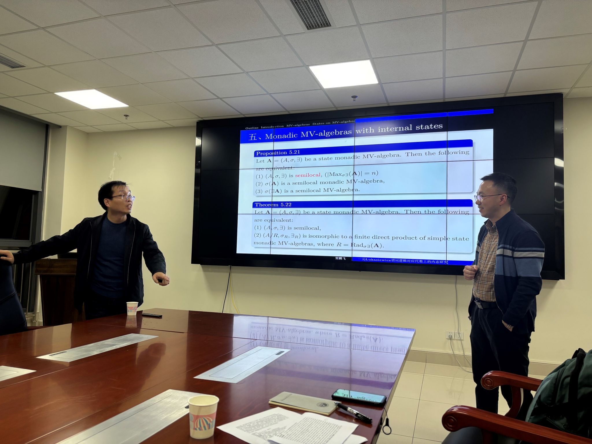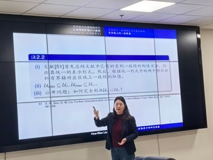会议首日的讲座聚焦于逻辑推理与代数的深层次融合,探讨了非经典逻辑在现代信息处理中的应用。贺鹏飞教授(陕西师范大学)在开场讲座《一元Łukasiewicz谓词逻辑对应代数上的内态研究》中,探讨了如何将非经典逻辑与概率理论相结合,提出了基于Łukasiewicz逻辑的概率模型,并进一步分析了MV代数上的状态操作。贺教授的研究为非经典逻辑在信息科学中的应用提供了新的理论支持。苏勇教授(苏州科技大学)在《Idempotent Uninorms》讲座中,深入分析了冯诺依曼代数结构在模糊逻辑中的应用,介绍了不同类型的Idempotent Uninorms,并探讨了其在信息聚合函数中的理论进展。这一研究为复杂系统的推理与决策提供了新的数学工具。李刚教授(齐鲁工业大学)则在《聚合算子间的弱支配》讲座中,讨论了聚合算子间的支配关系,特别是在模糊逻辑中的应用。李教授提出的弱支配概念及其与相关不等式的联系,为模糊系统理论的发展开辟了新思路。