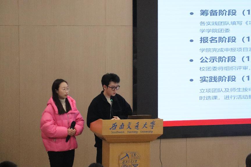 团建中心王星阳与青年志愿者协会杨越溪共同宣讲寒假“返家乡”社会实践活动的相关事宜。王星阳从申报流程、学校支持等方面详细介绍了寒假“返家乡”社会实践活动的申报事宜。杨越溪则阐述了参与社会实践对大学生全面发展的重要意义,并为同学们提供实例介绍及经验分析,鼓励2024级同学积极参与实践,为自己的大学生活增添一抹亮丽的色彩。