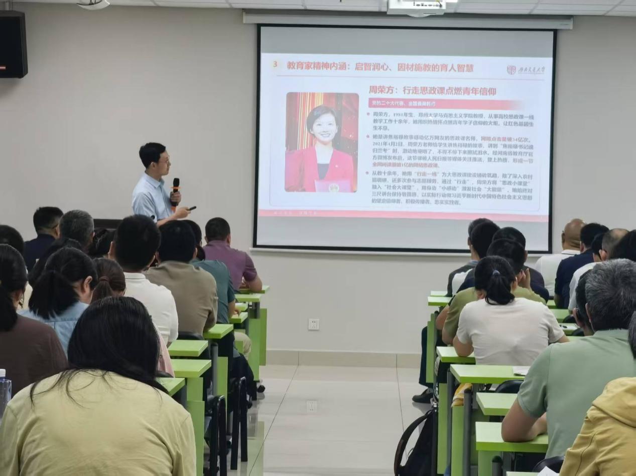 弘扬教育家精神宣讲团成员,地球科学与工程学院党委副书记、纪委书记郑波作题为“大力弘扬教育家精神、争做新时代大先生”的专题报告。郑波从追求师德“高线”,自觉践行教育家精神;守住师德“标线”,以十项准则规范行为;远离师德“红线”,以案为鉴,警钟长鸣三个方面,就教育家精神的内涵、新时代高校教师职业行为十项准则、师德师风警示教育进行了深入解读。