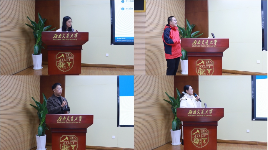 博士研究生邓迪凡、郑星宇、王子成、吴鸿杰分别作题为《Intersection vectors over skew-tilings》《最短线性编程问题的新求解算法》《面向认知MIMO雷达目标检测的决策智能》《Spreading speeds for a Lotka-Volterra competition system with advection in a periodic habitat》的报告。