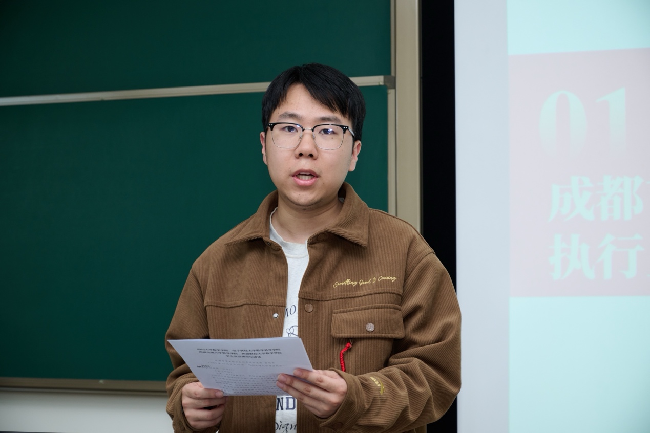 张敬文对成都市学联的莅临指导及四川大学、电子科技大学、西南财经大学师生的到来表示欢迎,她指出,要立高远之志,以数学精神筑牢青年信仰根基;聚融合之力,以学科交叉激发文化创新活力;筑合作之桥,以校际联动共育拔尖创新人才。
