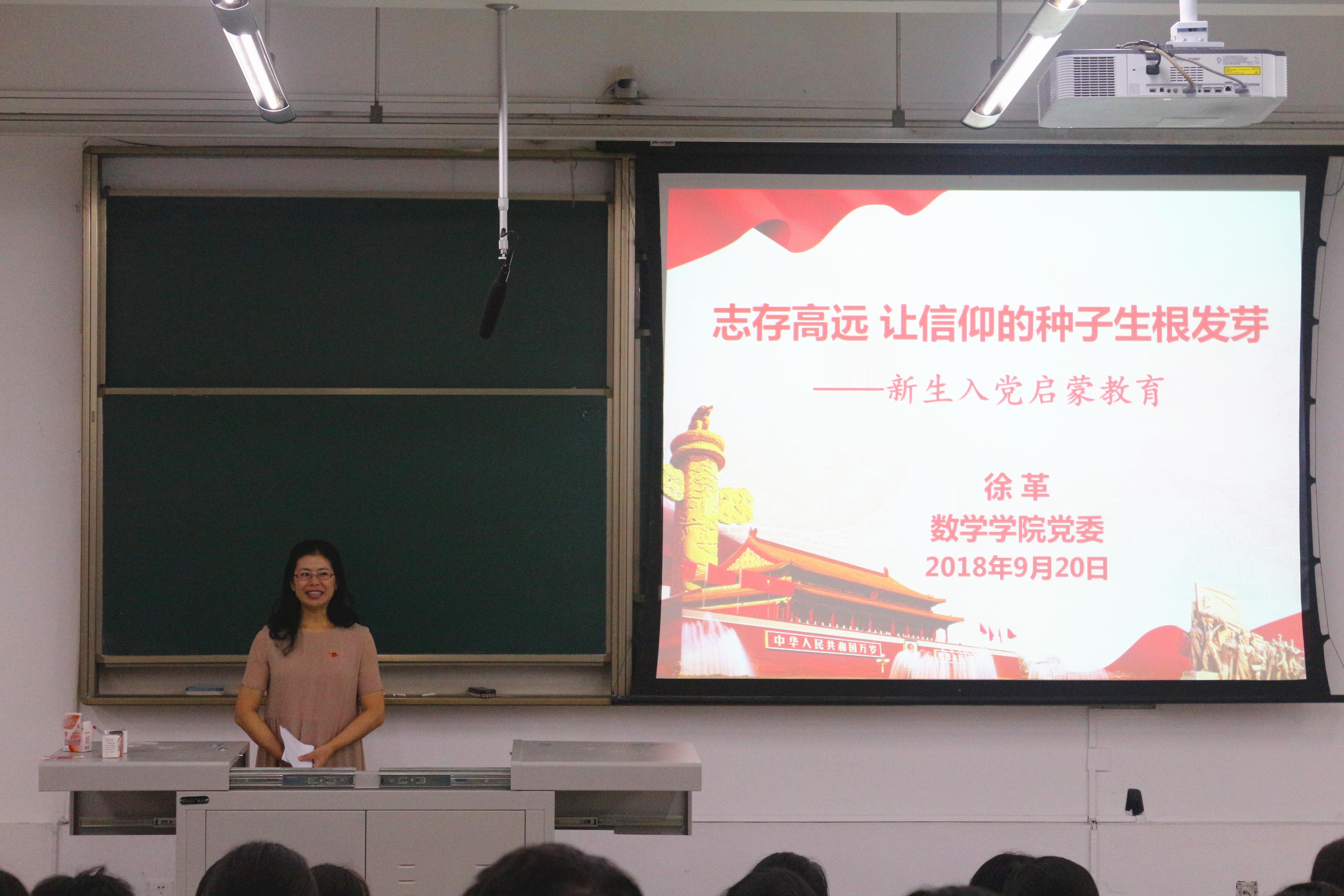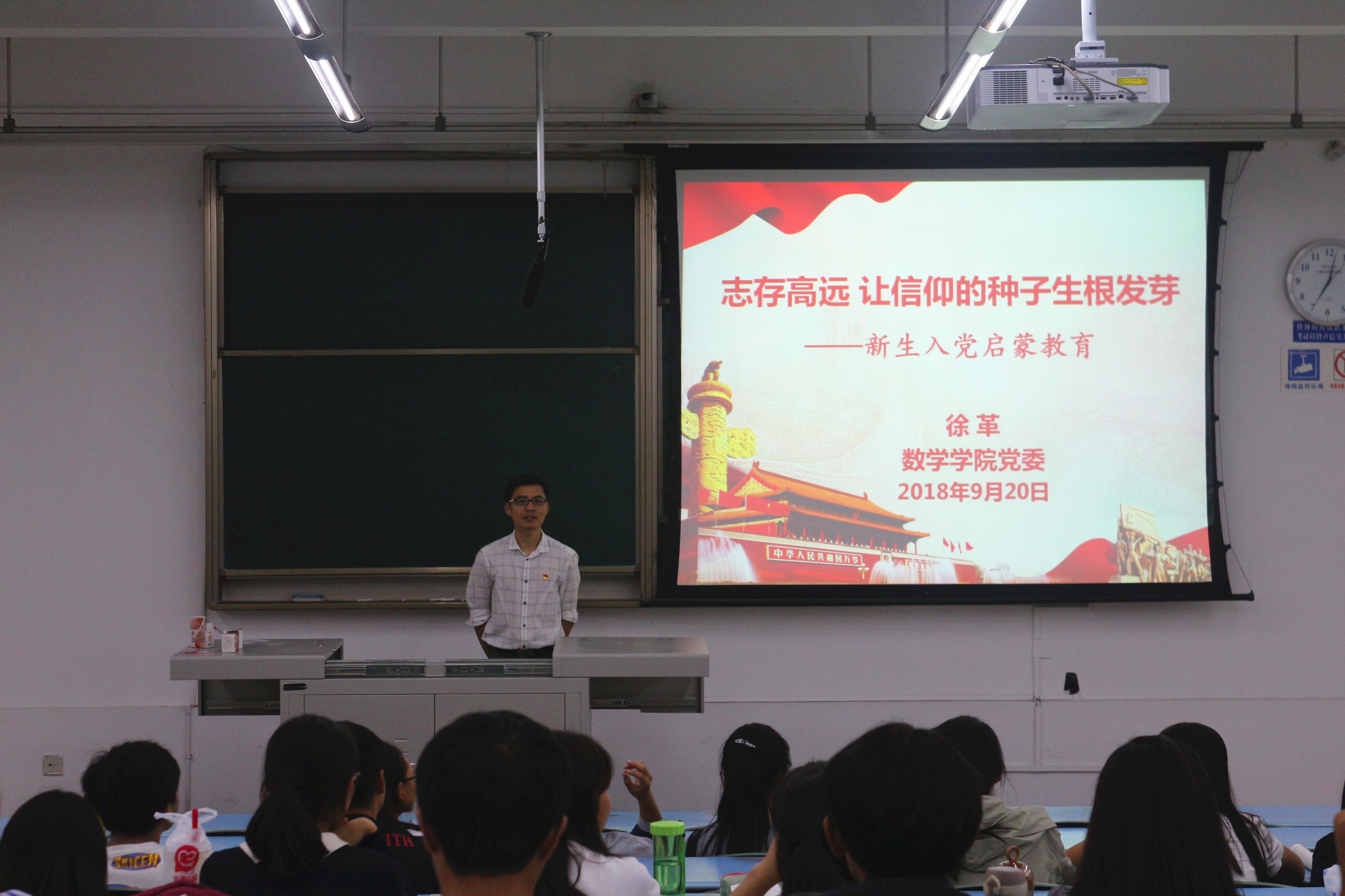 党委书记徐革为2018级全体本科生开展了以“志存高远,让信仰的种子生根发芽”为主题的入党启蒙专题讲座,学院党委副书记杨育鸿和18级辅导员钟义婷也到场聆听了本次讲座。