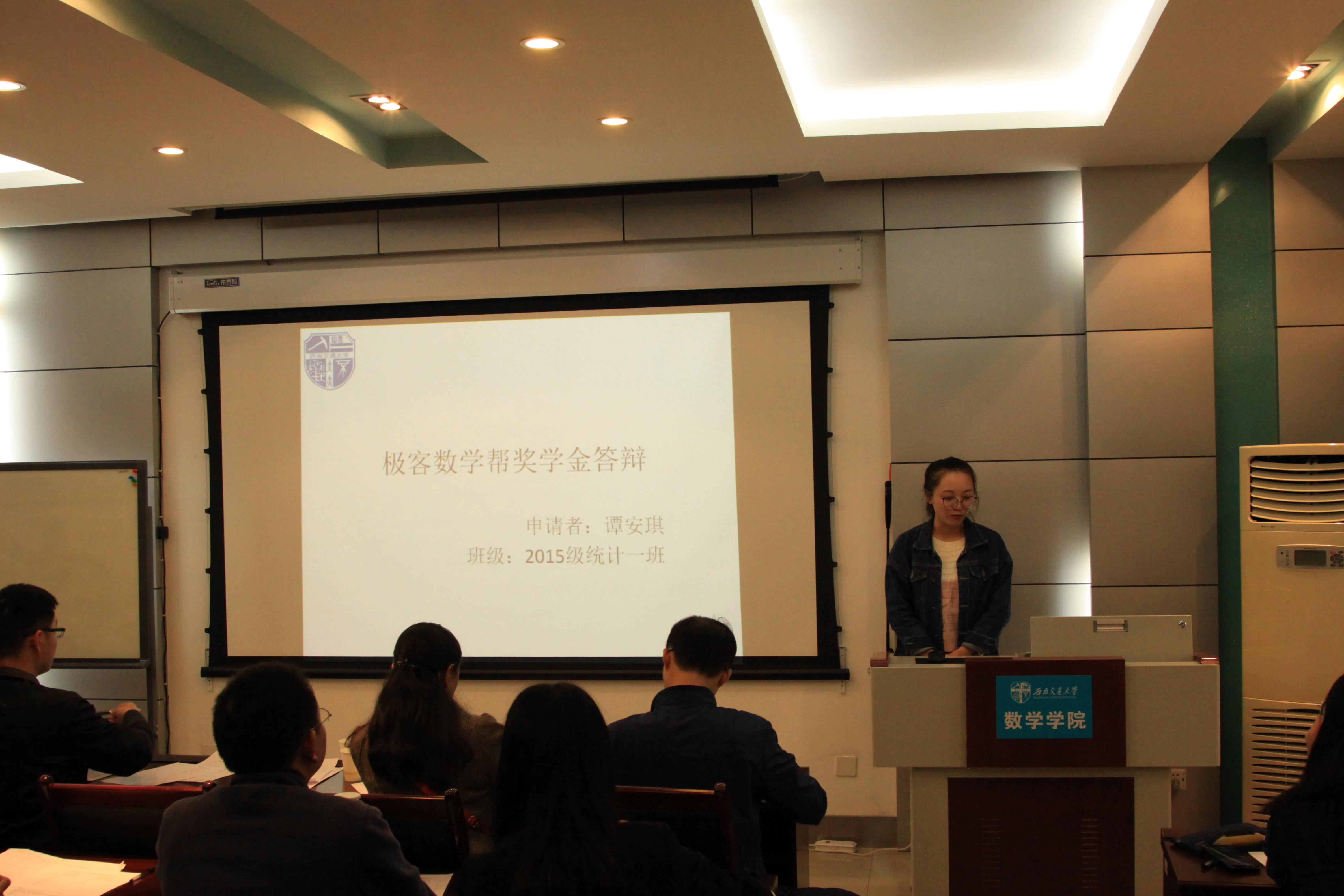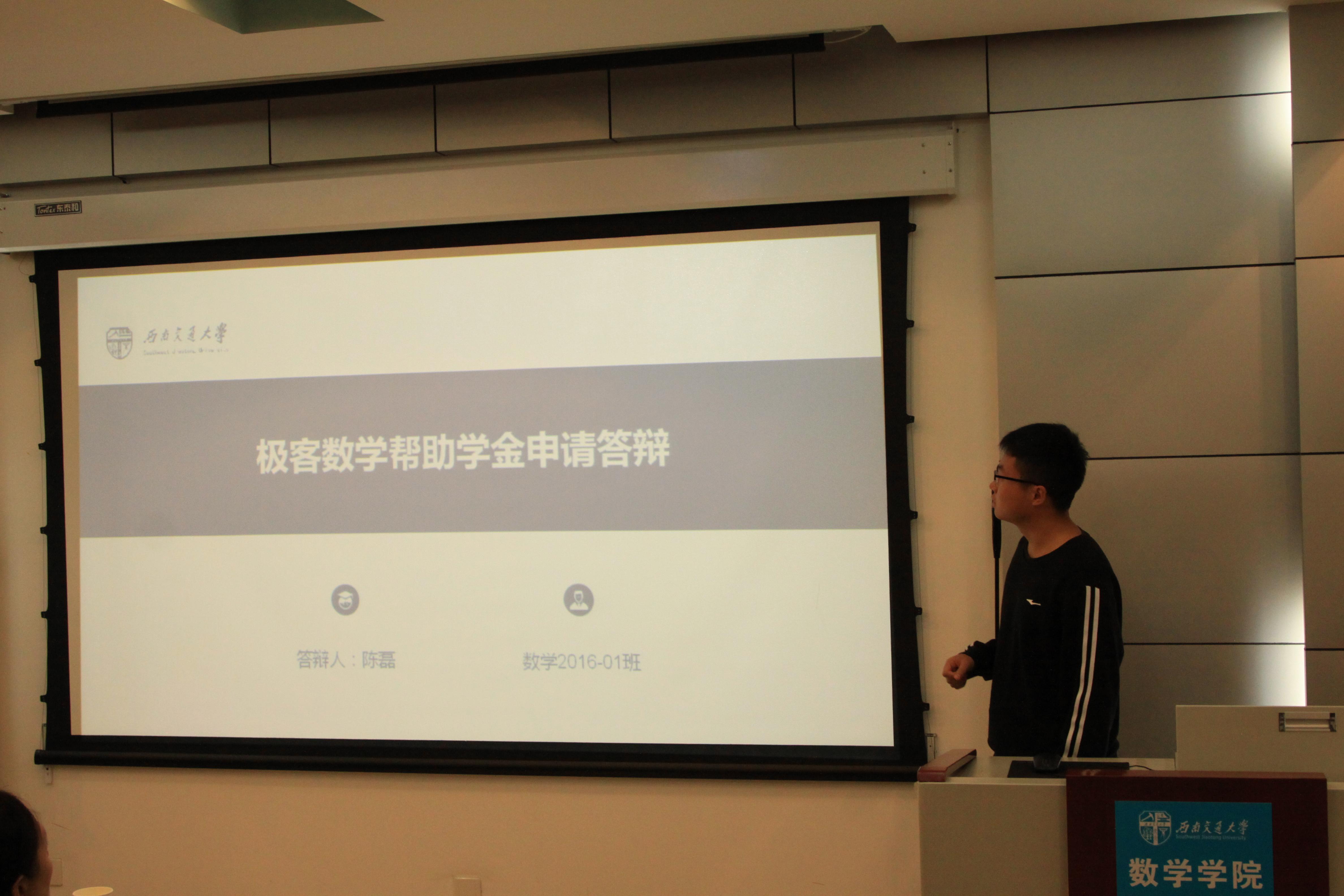 然后进行的是极客数学帮助学金答辩,答辩者介绍了自己的家庭经济情况,也展示了自己在学校取得的一些优异成绩,同时表达了自己在日后继续奋发向上的决心。