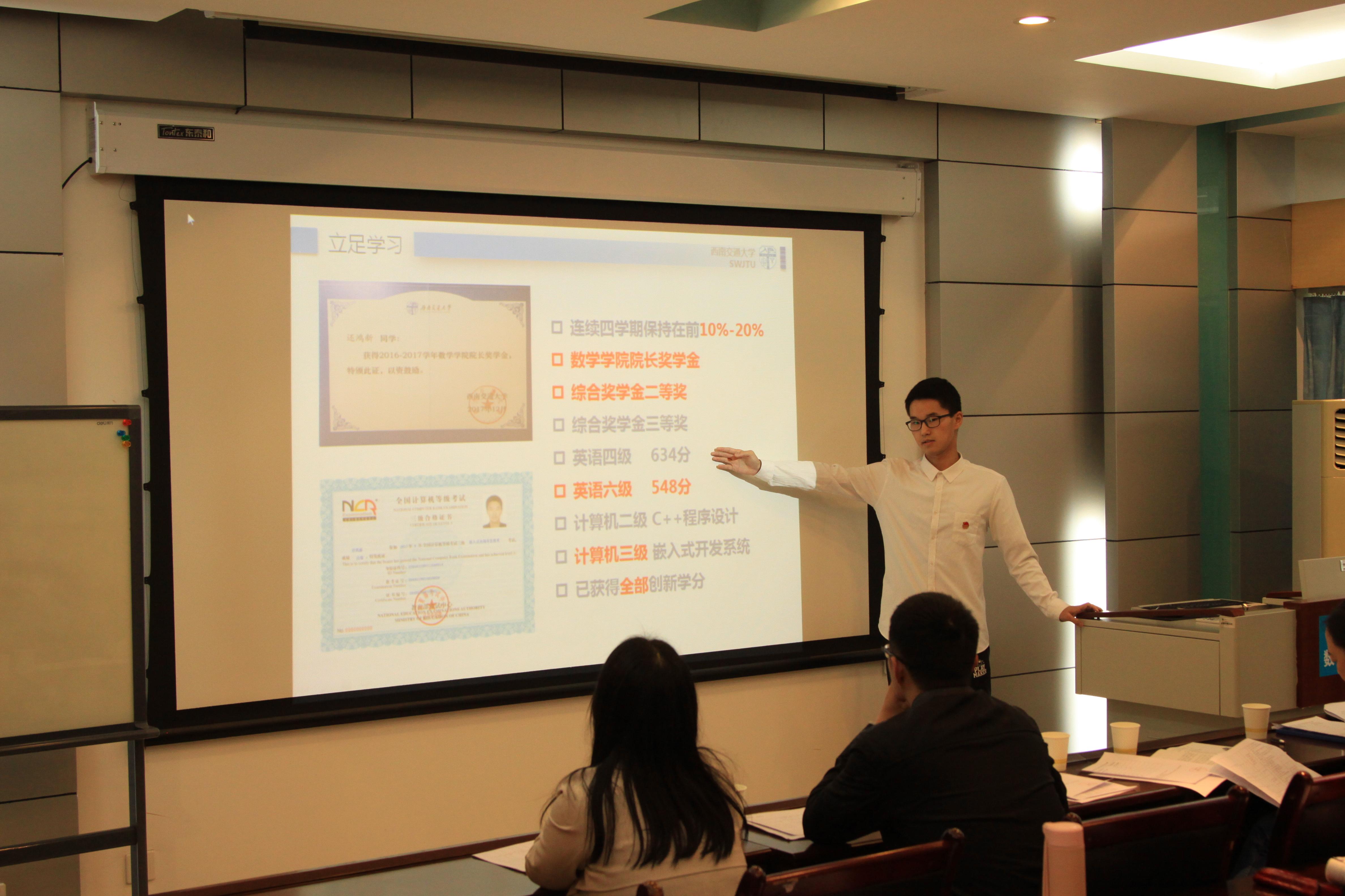 首先进行的是极客数学帮奖学金答辩,答辩者从学习情况,科研竞赛,学生工作,社会实践等方面进行了自我的展示,彰显了交大学子优秀的综合实力。