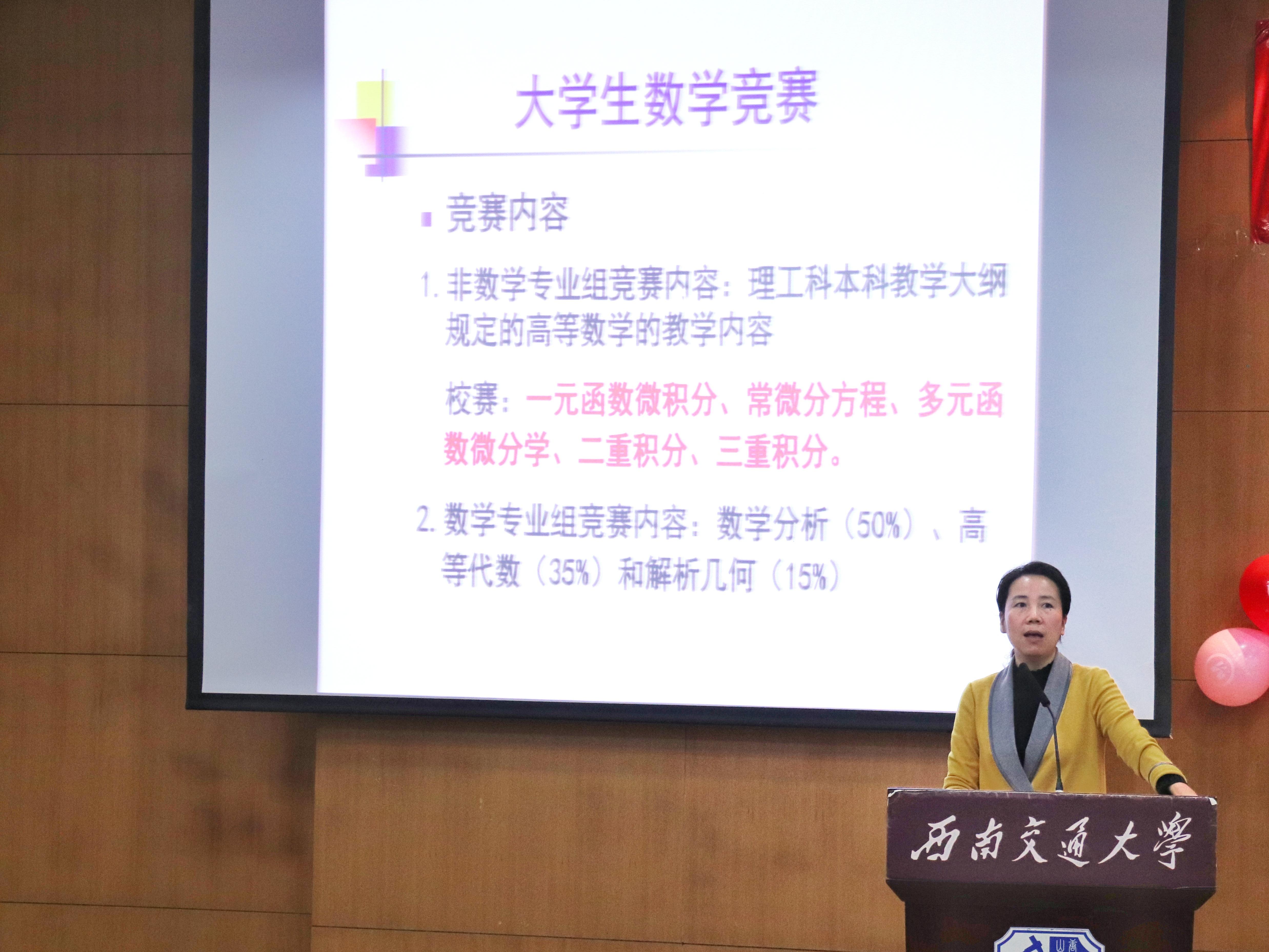 公共数学研究部主任,全国大学生建模竞赛国家优秀指导教师梁涛副教授为同学们介绍和讲解全国大学生数学竞赛和数学建模竞赛。梁涛老师从全国大学生数学竞赛的类别,竞赛情况,竞赛安排以及数学建模大赛的竞赛起源、赛制、参赛要求、比赛内容等几个方面进行介绍,并对历年真题进行讲解。同时,梁涛老师还向同学们推荐了与竞赛有关的网站,让同学们对这两类比赛有了充分的了解与认识。最后,梁涛老师以“一次参赛,终身受益”鼓励大家积极参赛。