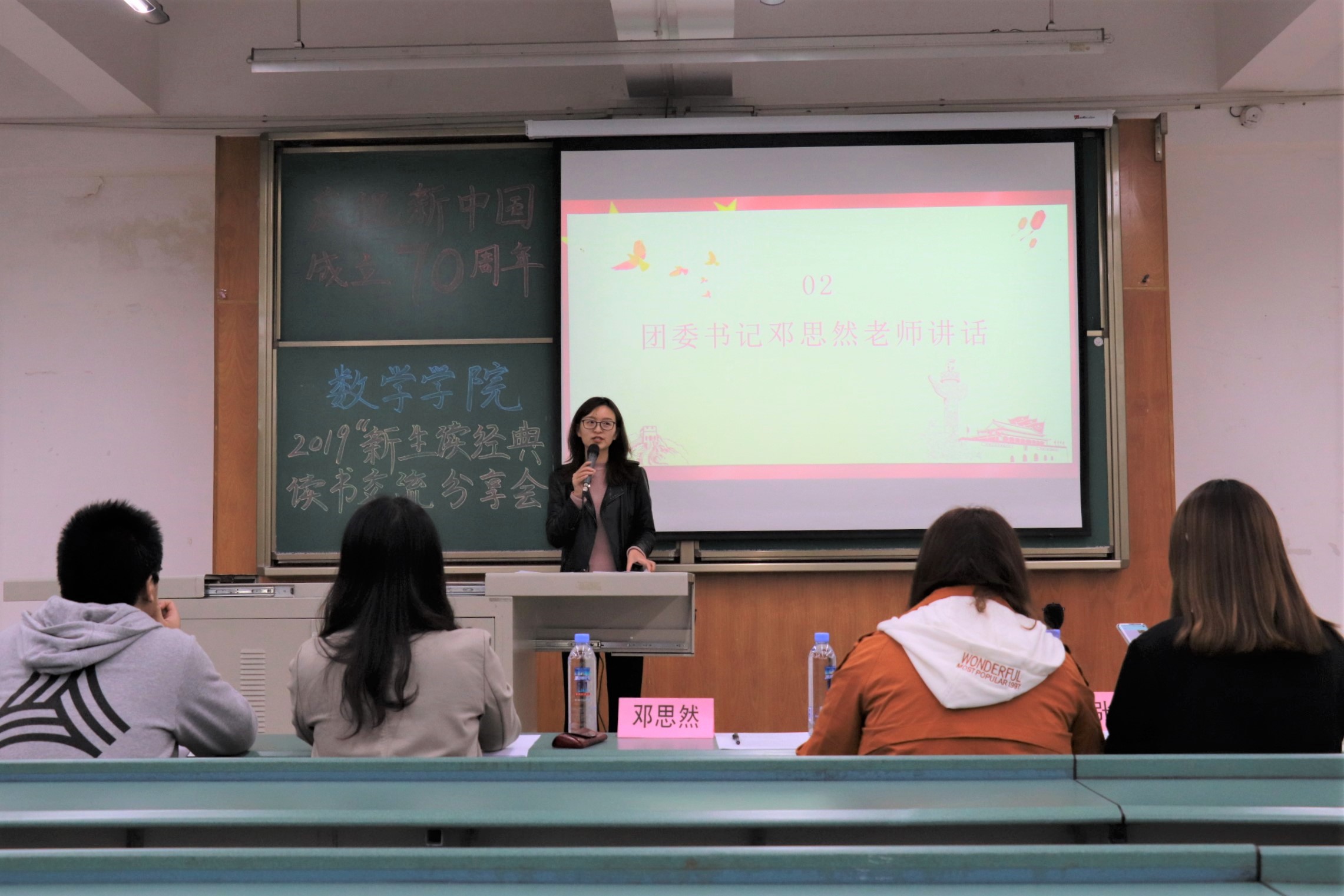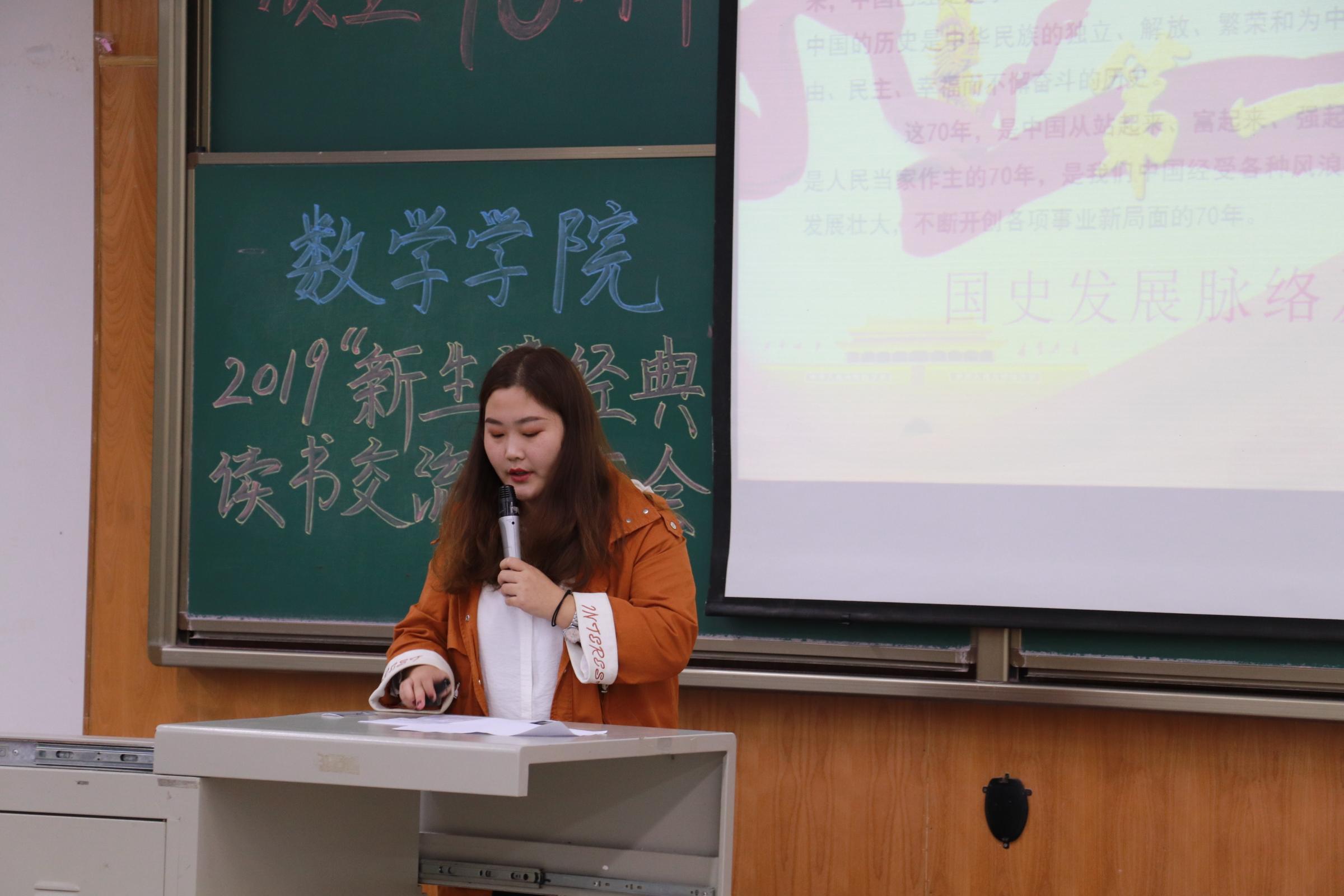 接下来,议程第四项。辅导员王亚梅老师带来阅读分享《读国史有感》。王亚梅老师从国史发展的脉络及学习意义、中国七十年历史的过程回顾、七十周年的伟大奇迹等方面表达自我认知,出乎史,入乎道。历史是最好的教科书,让国史之光照亮未来,为中华民族伟大复兴的“中国梦”注入力量。