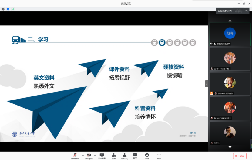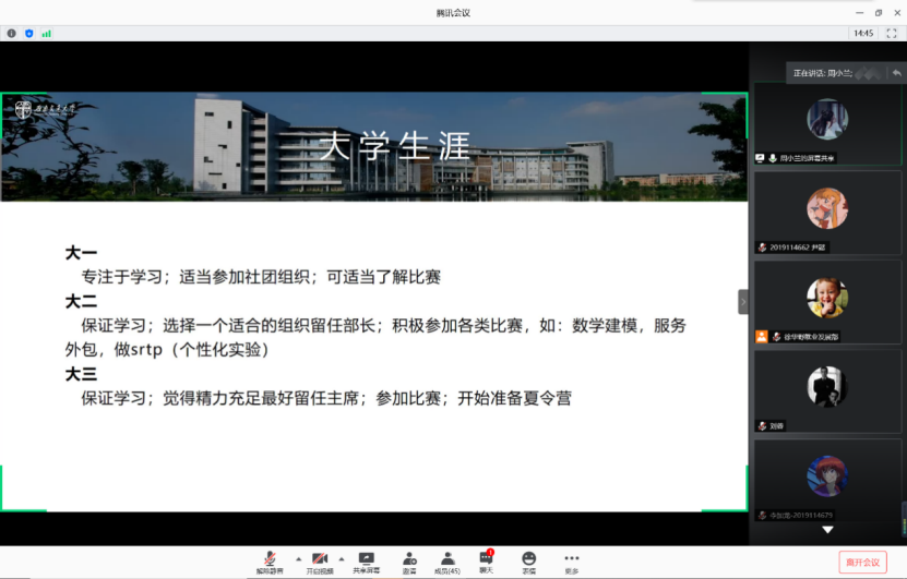 2020年保研经验分享会于线上准时进行。本次经验分享会由就业发展部徐华野同学主持,周小兰,赵海,江自豪三位同学进行主讲。