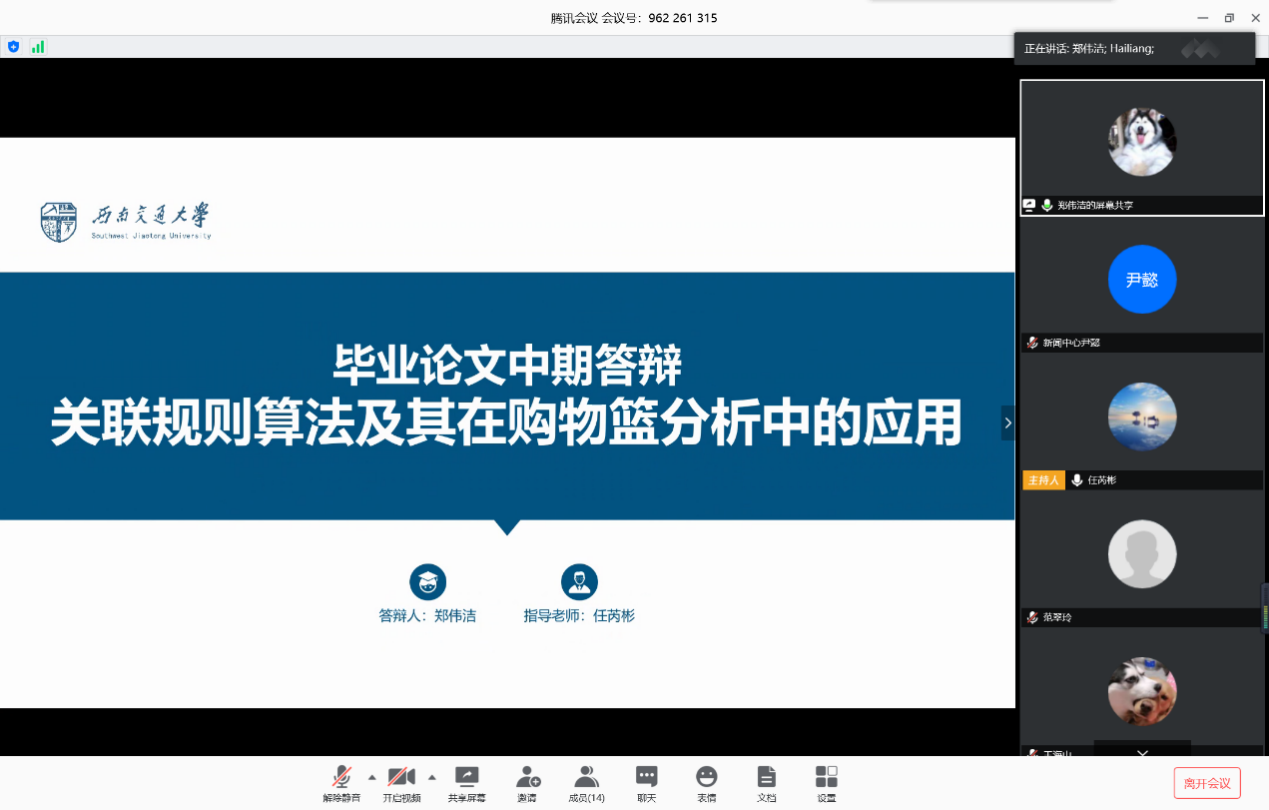 此次中期答辩分成14个答辩小组,各小组由组长老师带领,分别通过各自会议同时进行答辩。在老师们完成材料审定后,同学们按照小组答辩顺序依次进行答辩。学生们就研究问题从研究背景、研究方案、研究进度、后续安排及问题等方面进行5分钟PPT展示。随后,认真观看的指导老师们就展示材料提出相关疑问,指出论文不足之处,并结合实际提出有关见解和修改建议。最后,老师们对毕业生毕业论文的前期工作情况进行了评议。面对老师的提问,同学们也自信作答,积极接受老师建议。