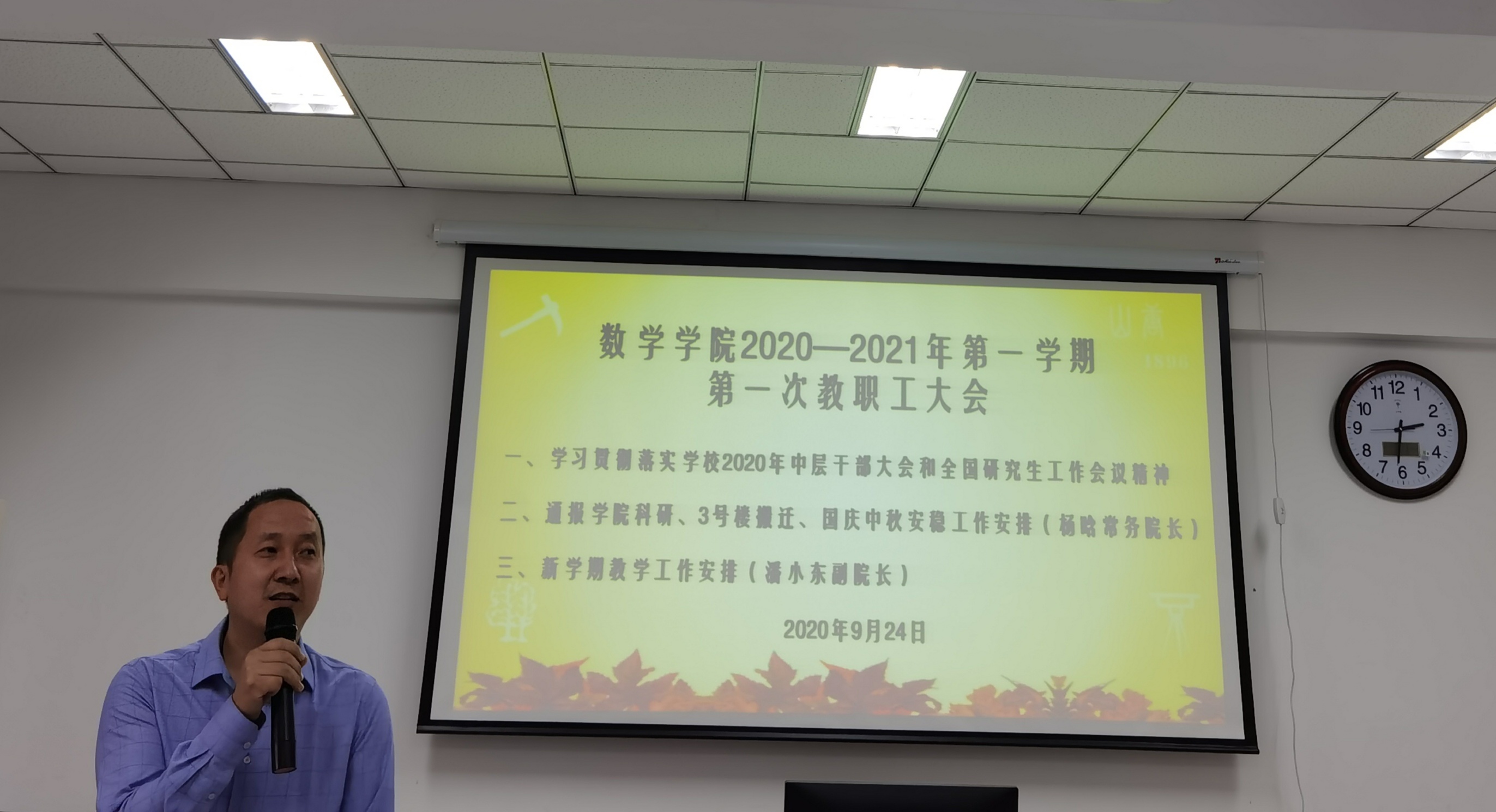 杨晗常务院长传达了全国研究生教育大会精神和学校2020年中层干部大会精神,强调了学院高度重视全国研究生教育大会精神的学习和落实,并要求:全体教师要充分认识到研究生教育的重要性与战略性,提高思想政治站位,增强我院研究生教育的责任感、使命感;要严格按照学校党委要求,高度重视安稳、意识形态安全、保密、就业等工作;要结合学院实际教学和科研工作,制订好工作重点和计划,继续推动学院和学校的全面发展。