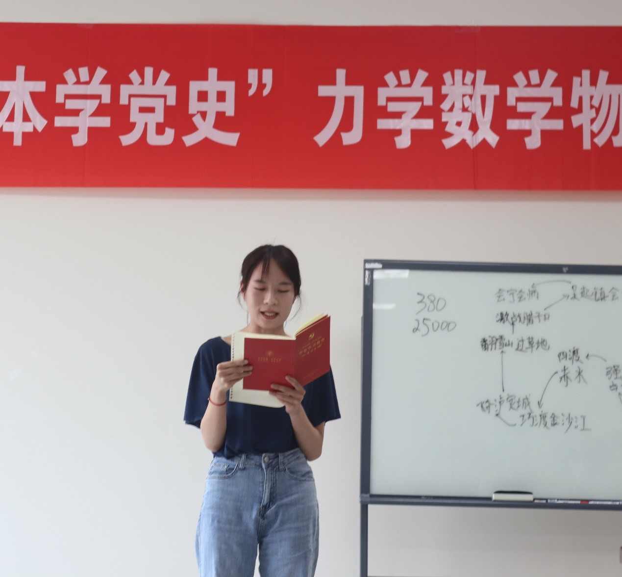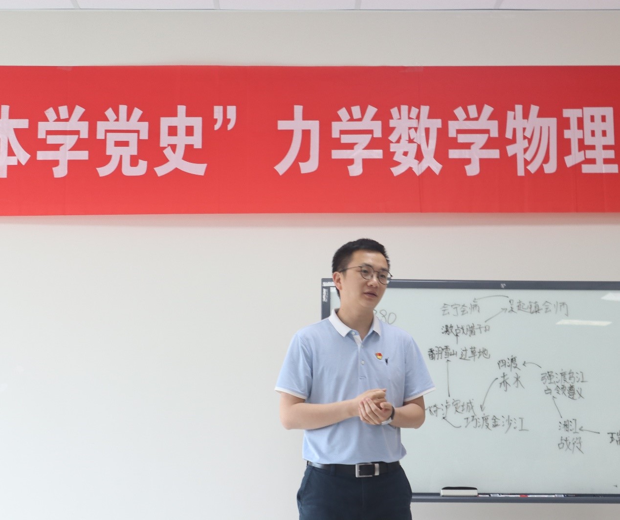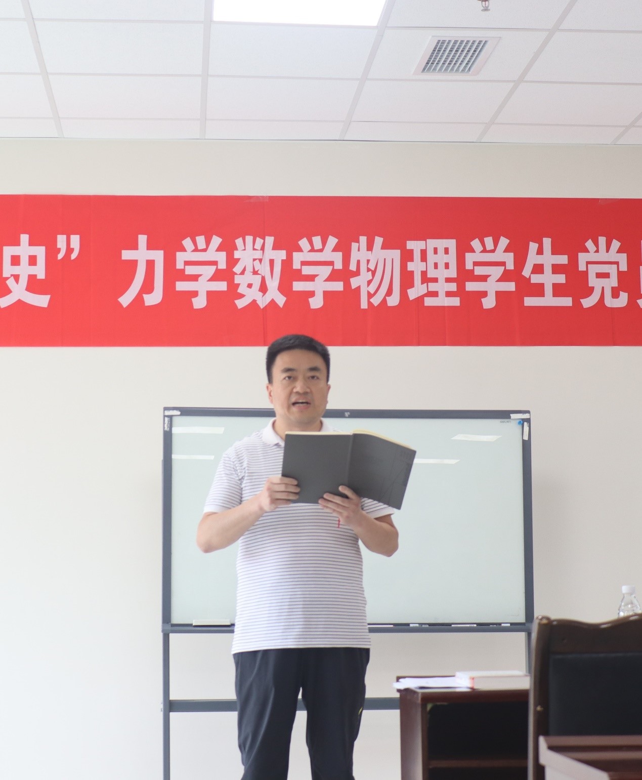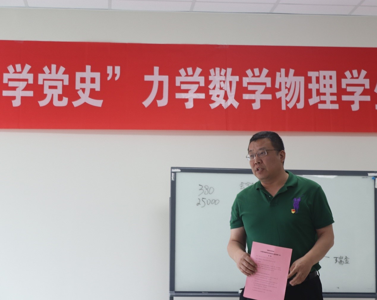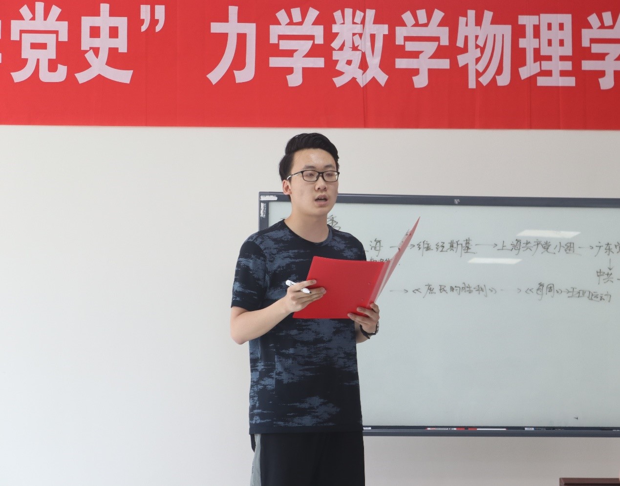 党委副书记黄祥向莅临学院的各位老师和学生表示热烈的欢迎,并对本次活动进行了详细的介绍:“原原本本学党史”力学数学物理学生党员党史学习擂台赛由力学、数学、物理学院党委联合举行,以《中国共产党简史》为学习内容,采用三学院学生擂台赛形式和周围学、轮流讲、同讨论等方式,每周针对一至两章内容进行学习,并由在场的学生党员进行评分。比赛要求在学习和讲述中不用电脑、手机、PPT,通过书写板书原原本本学党史、讲体会,使党史学习深入人心。