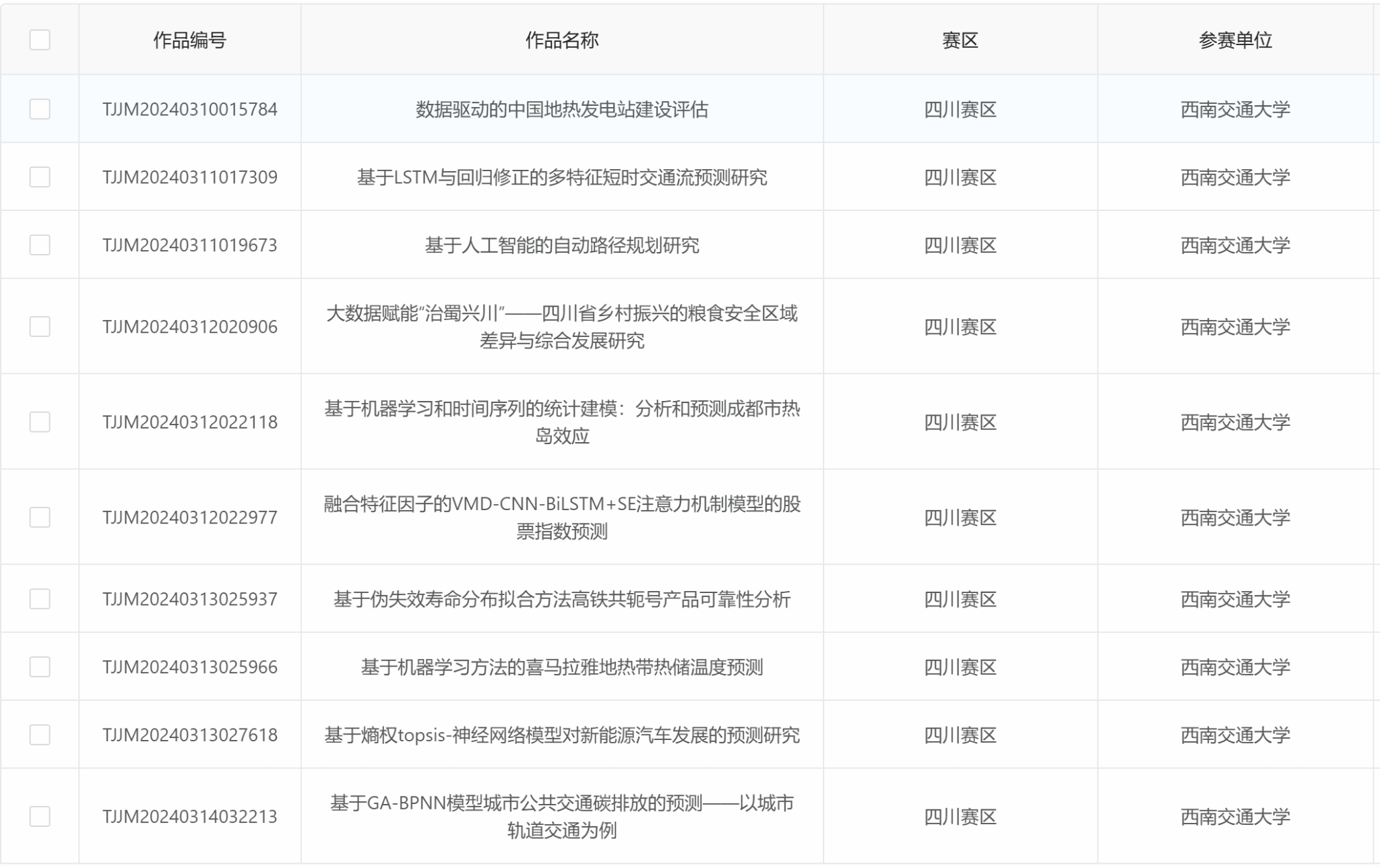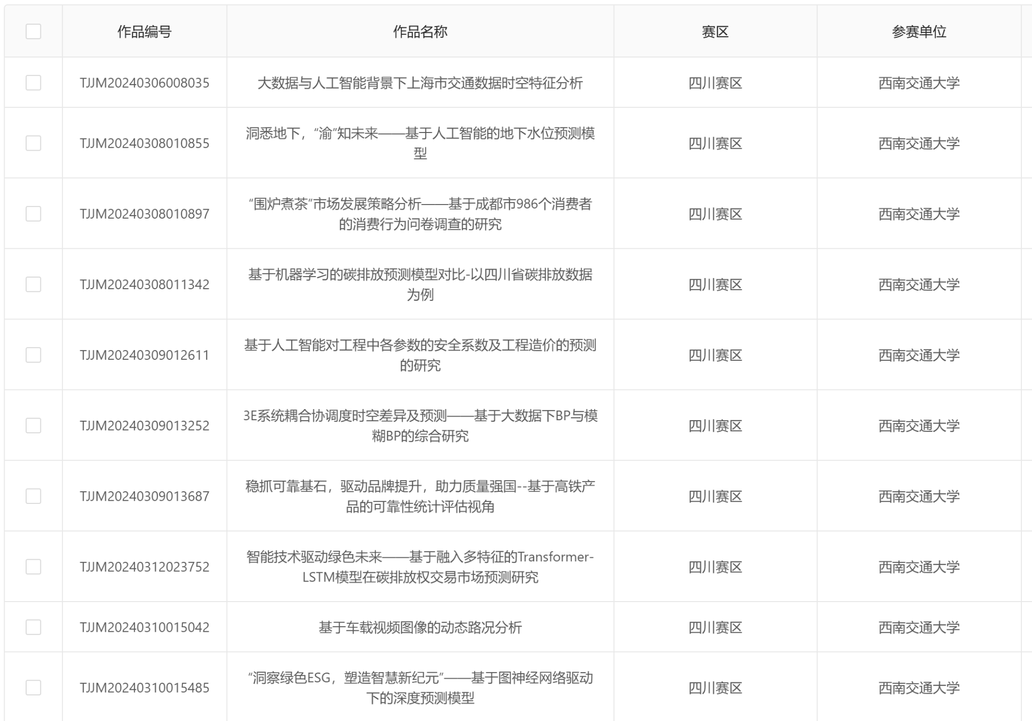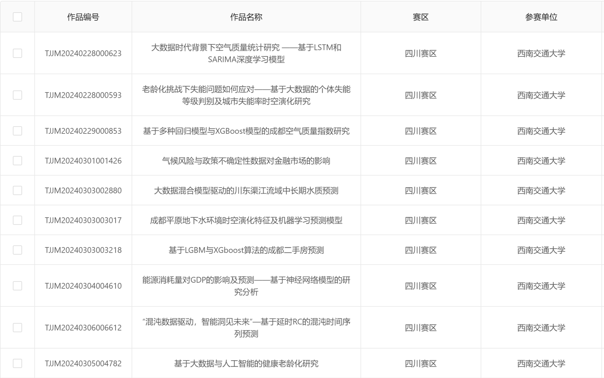 第1届统计建模校校内选拔赛已于2024年5月22日上午在犀浦校区9号教学楼9136,2024年5月22日下午在犀浦校区3号教学楼30348,2024年5月30日下午在犀浦校区3号教学楼30425顺利举行。现将校级晋级省赛名单公示,四川赛区统计建模组委会将随机选取匿名作品进行复核与评议,最终晋级省赛名单以四川赛区公示为准。