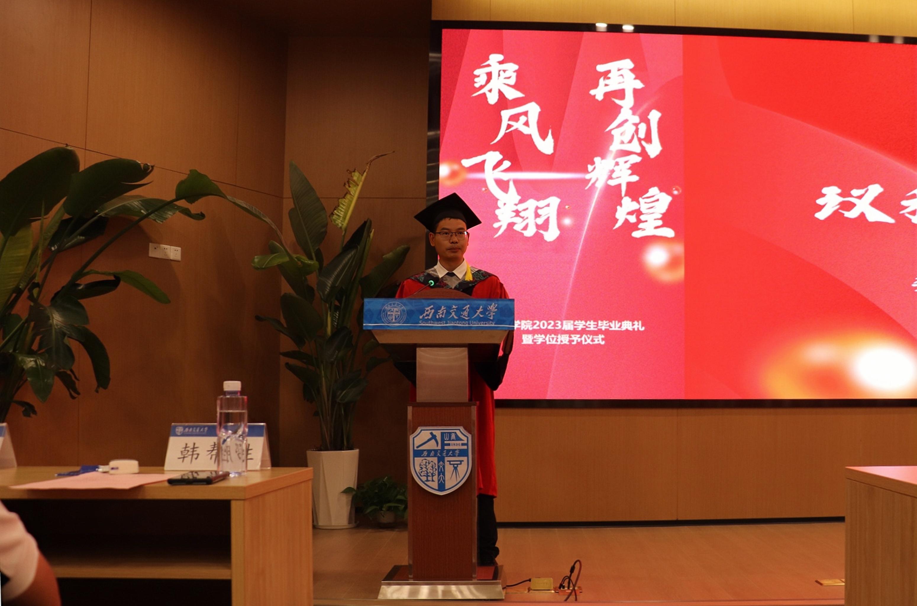 典礼第三项,毕业生代表发言。2023届研究生毕业生代表何鑫海言道,在交大的三年,他见证了交大的变化,交大也见证了他的成长。“长风破浪会有时,直挂云帆济沧海”,祝愿师弟师妹们在科研的道路上硕果累累,再创佳绩,祝毕业生们前程似锦,一路辉煌!
